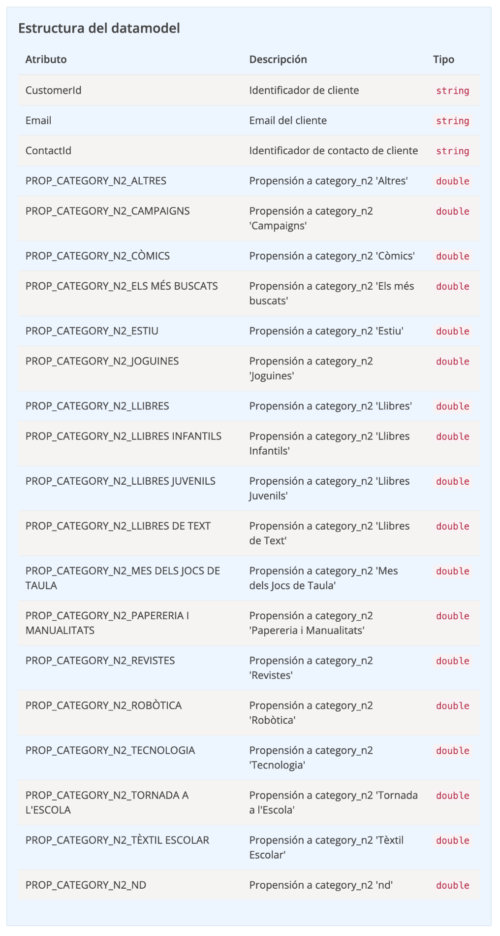 - PROP_ATRIBUTE_XXXX: These attributes are the essence of the Purchase Propensity Datamodel. Each one represents a customer’s propensity towards a specific attribute in the data model, from product categories to promotions. Each propensity is evaluated and assigned a value indicating how likely a customer is to purchase in that area.
