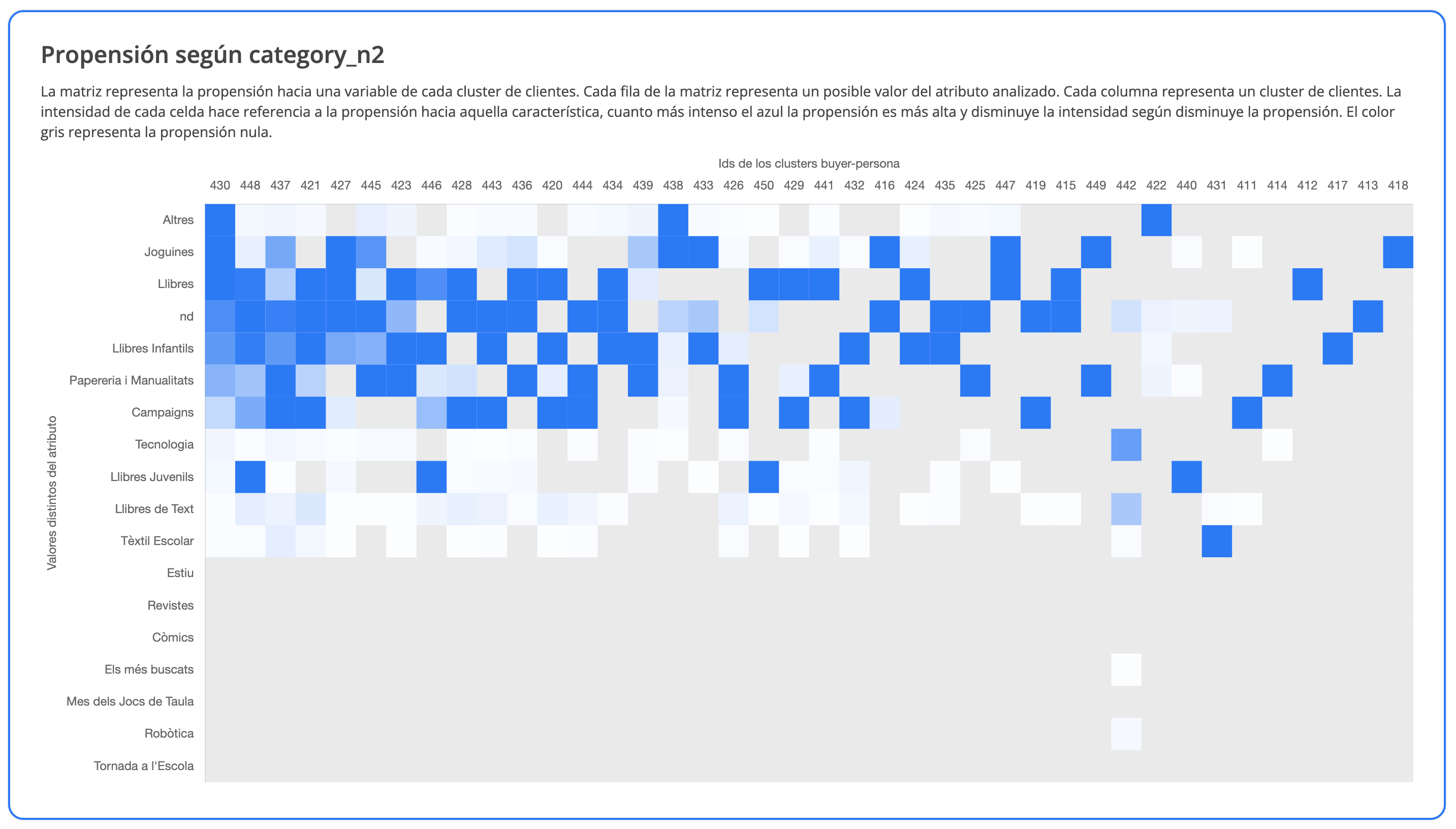 | 411 | Campaigns_Joguines_Llibres de Text | Customers interested in campaigns, toys, and textbooks. | 10,016 |