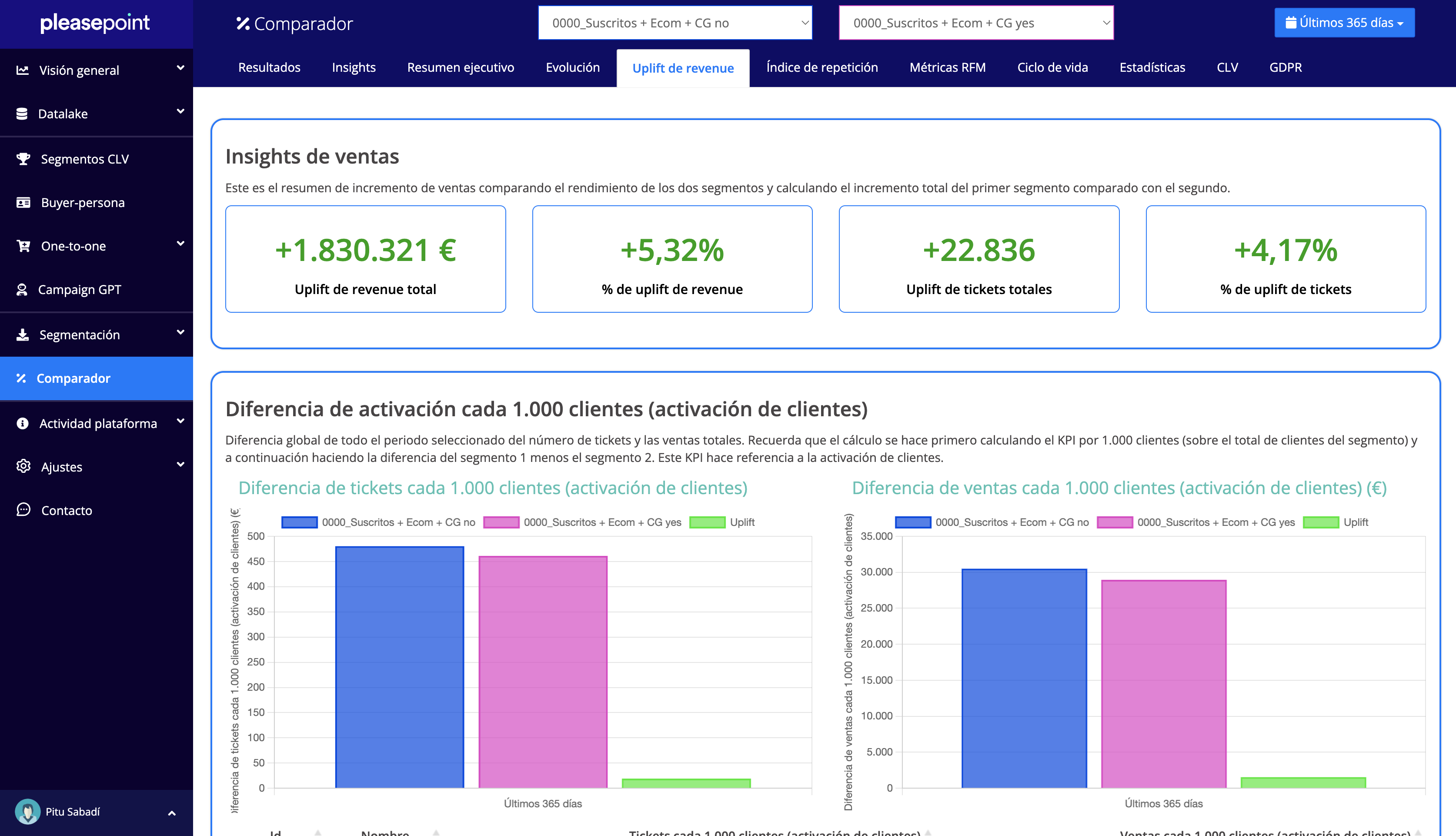 Once we have created our machine learning models, it is essential to evaluate their performance and conduct rigorous validation. With Pleasepoint, you can generate control groups among your users to measure the results of your CRM actions.