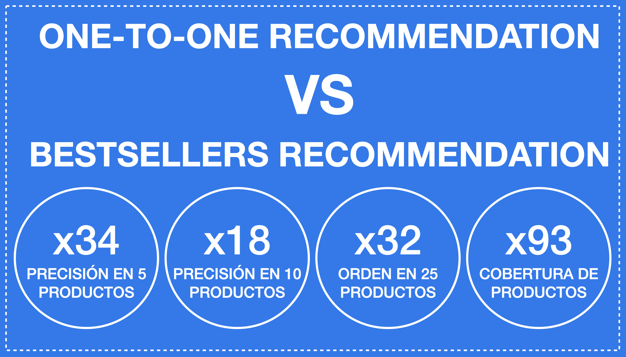 - Accuracy at 5 products: One-to-one recommendations showed a 34.45x improvement compared to bestsellers.