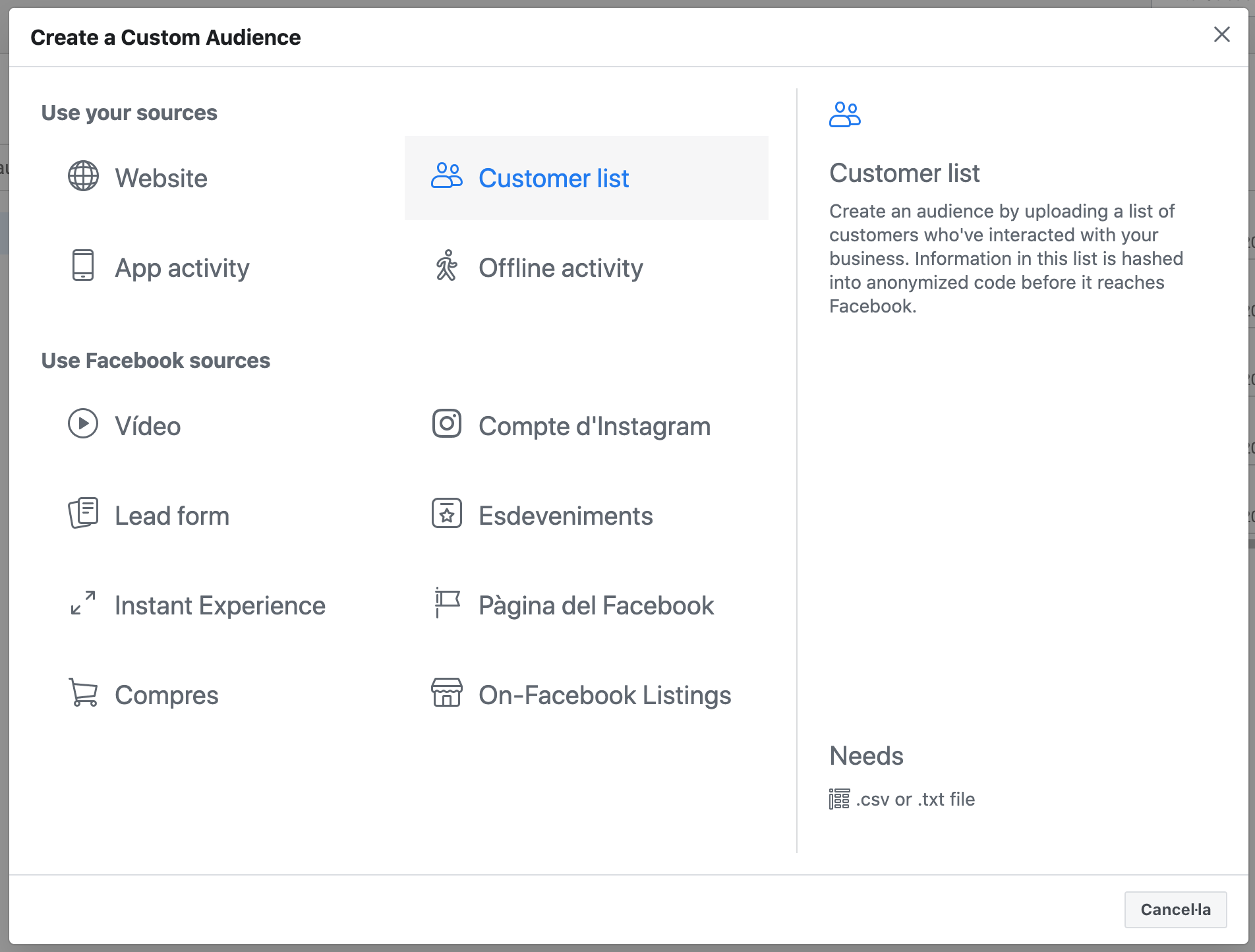 En este punto vamos a centrarnos en como crear audiencias custom a partir de tus clientes. Para ello necesitas crear una una audiencia custom a partir de una Customer List en Facebook Ads.