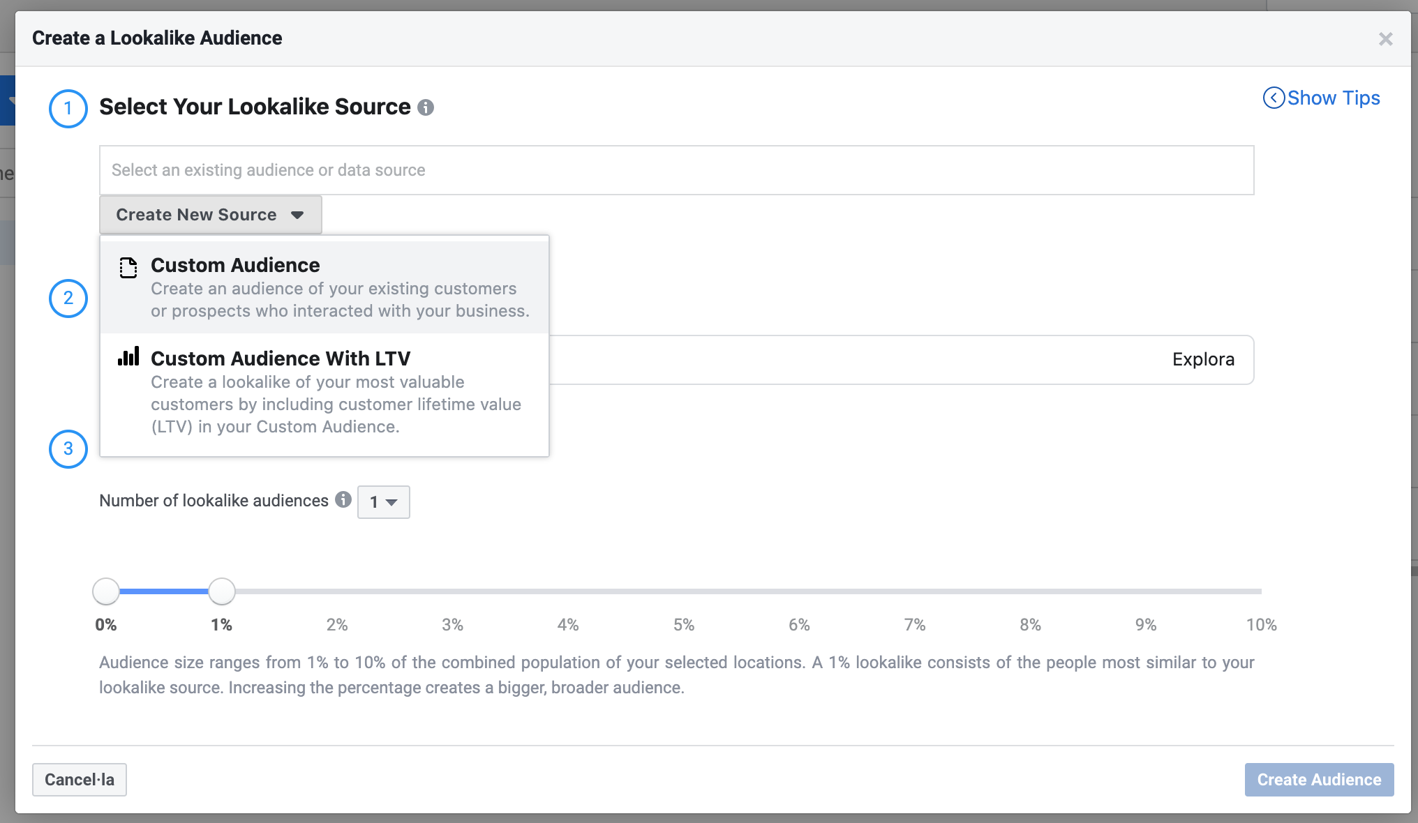 - Selecciona el tamaño de la audiencia: Debes escoger un valor entre el 1% y el 10%, siendo 1% un volumen más pequeño de usuarios de mayor parecido y 10% aumentas el volumen de usuarios bajando el parecido.