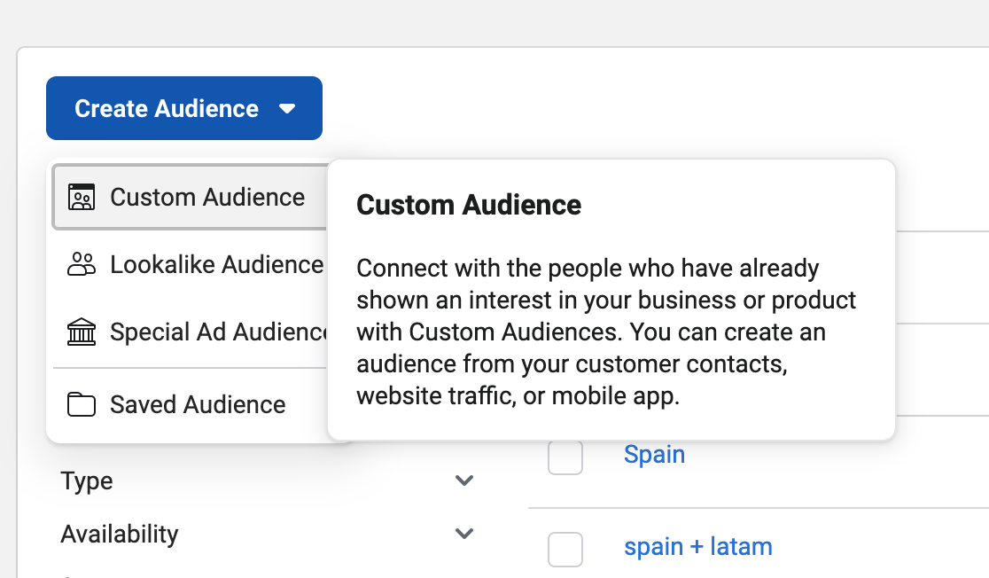 - Audiencia Custom: Creas una audiencia a partir de tus clientes existentes o de posibles nuevos clientes como los suscritores a la newsletter.