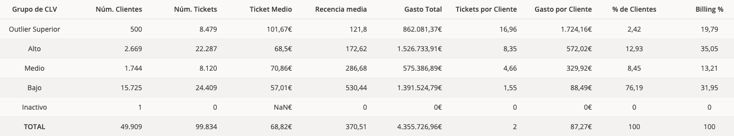 - High: Es el segundo grupo de clientes de mayor volumen de facturación siendo el segundo más pequeño. Se trata de tu cliente ideal ya fidelizado.