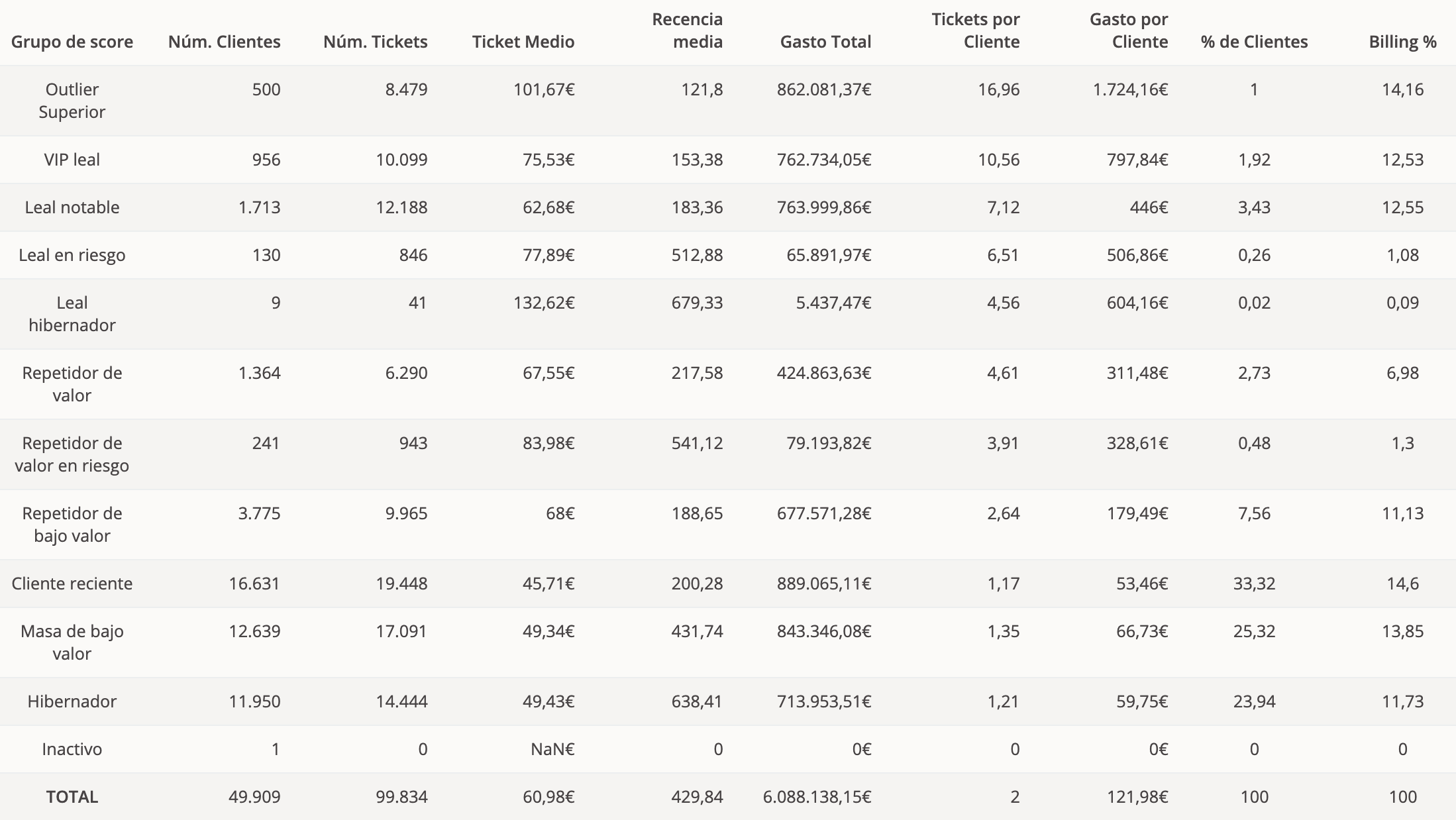 - VIP leal: 956 clientes con 10,56 tickets por cliente y un gasto individual de 797,84€.