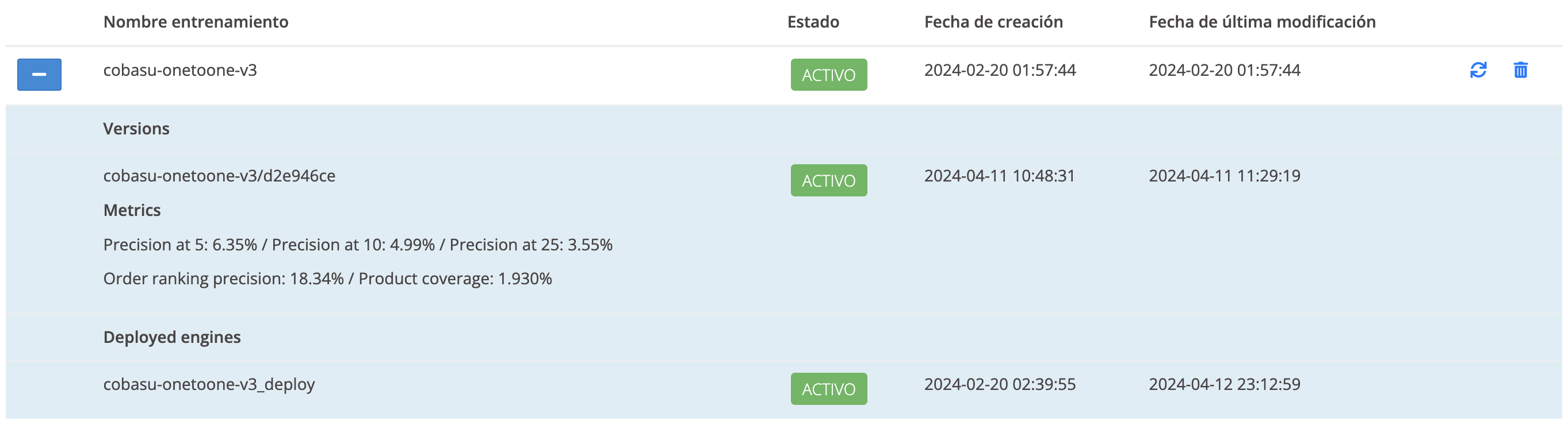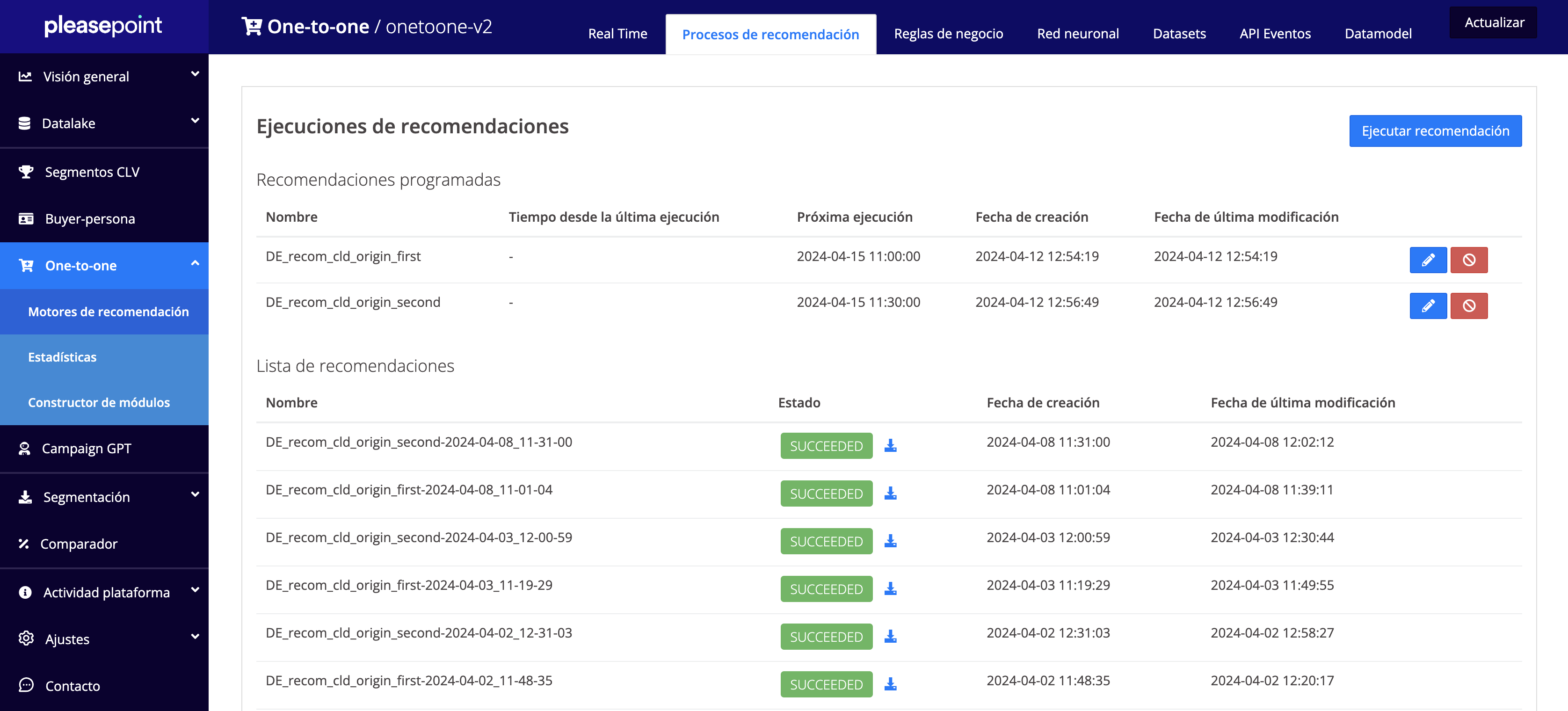 Estos son los resultados del entrenamiento del motor de recomendación one-to-one: