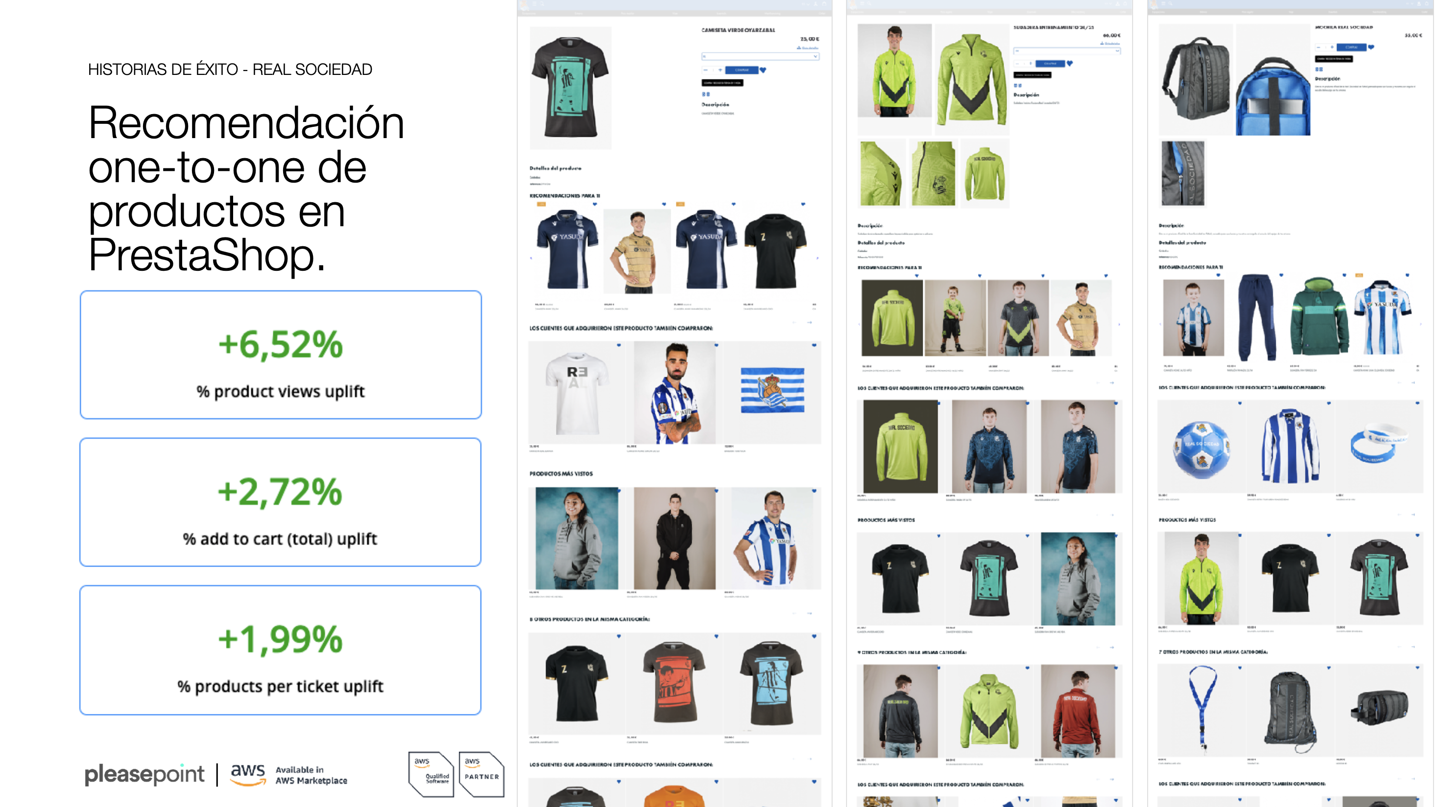 El módulo de Pleasepoint para PrestaShop permite implementar esto sin necesidad de cambios estructurales en la tienda. Con una integración sencilla y rápida, la Real Sociedad ha podido optimizar su estrategia de personalización y mejorar la conversión sin complicaciones.