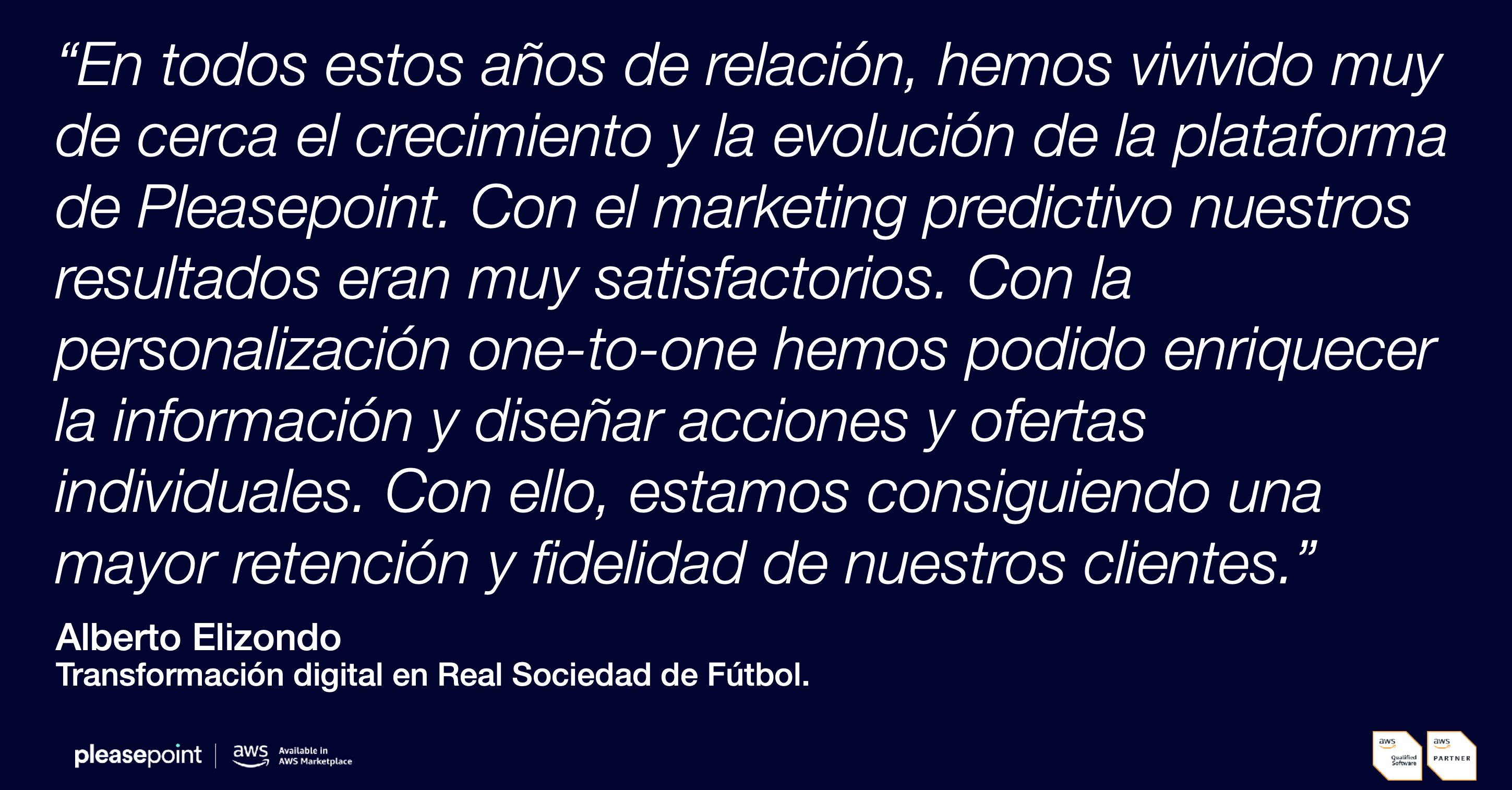 Transformación digital en la Real Sociedad"Trabajar con Pleasepoint nos permite descubrir nuevos comportamientos de compra de nuestros clientes, perfeccionar la implementación de campañas basadas en sus recorridos de compra y anticiparnos a las necesidades de los clientes. Gracias a todo esto, estamos ganando en personalización y mejorando el rendimiento de nuestras campañas."