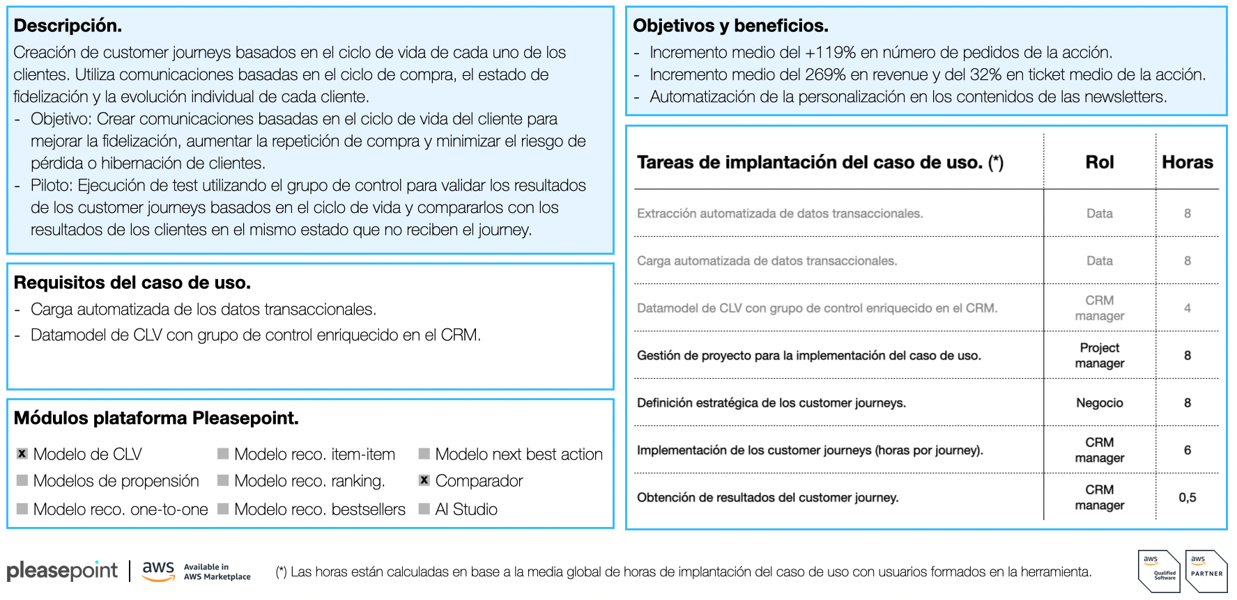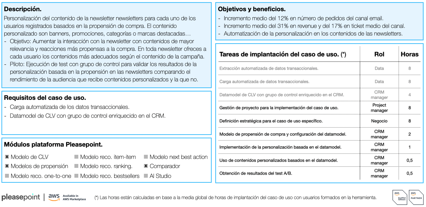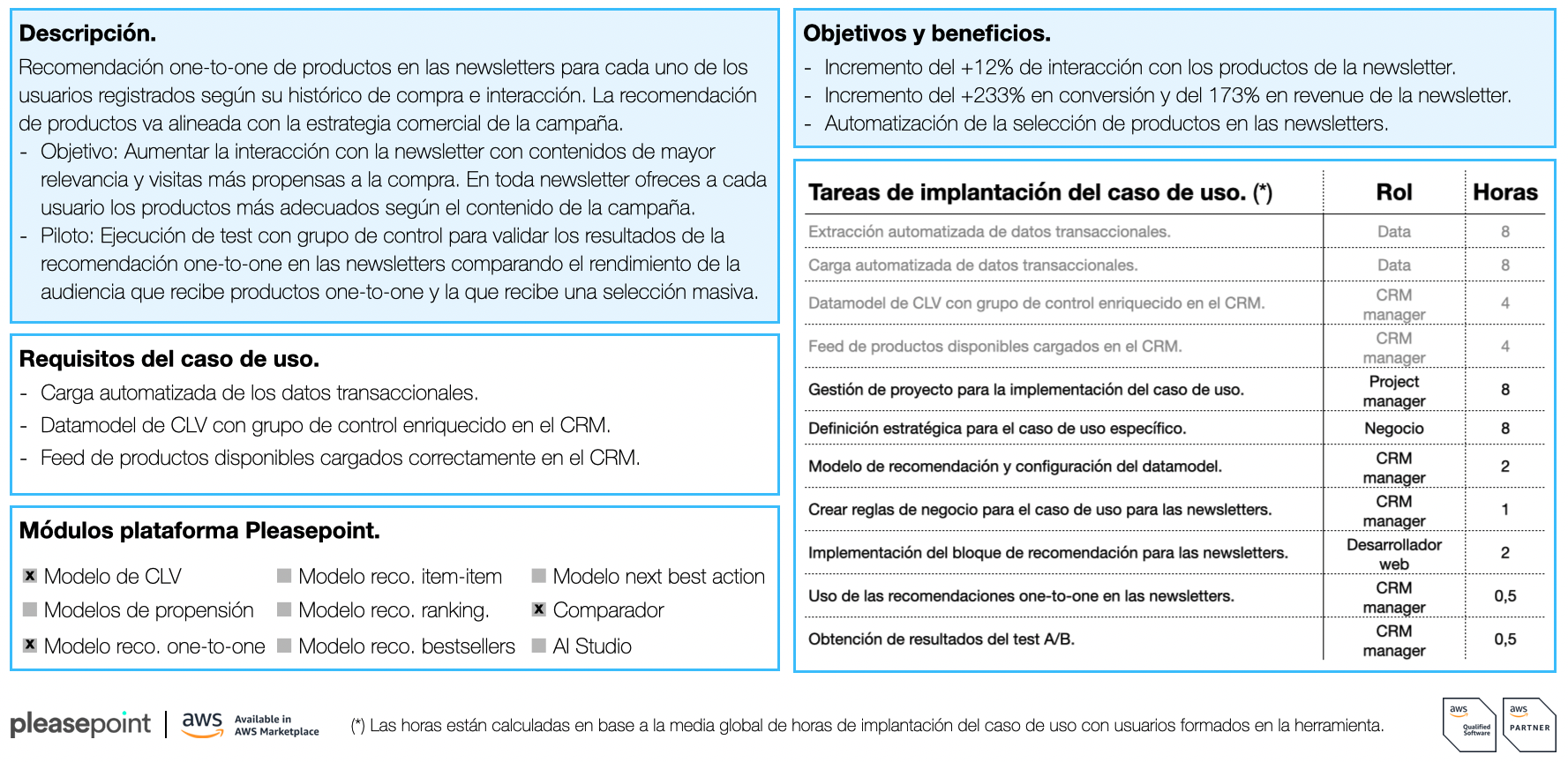 En los casos de uso que ahora verás se empieza implementando un piloto con un grupo de control para comparar los resultados de la personalización frente a las estrategias tradicionales. Utiliza la metodología de test A/B para medir la interacción, la conversión y el revenue generado.