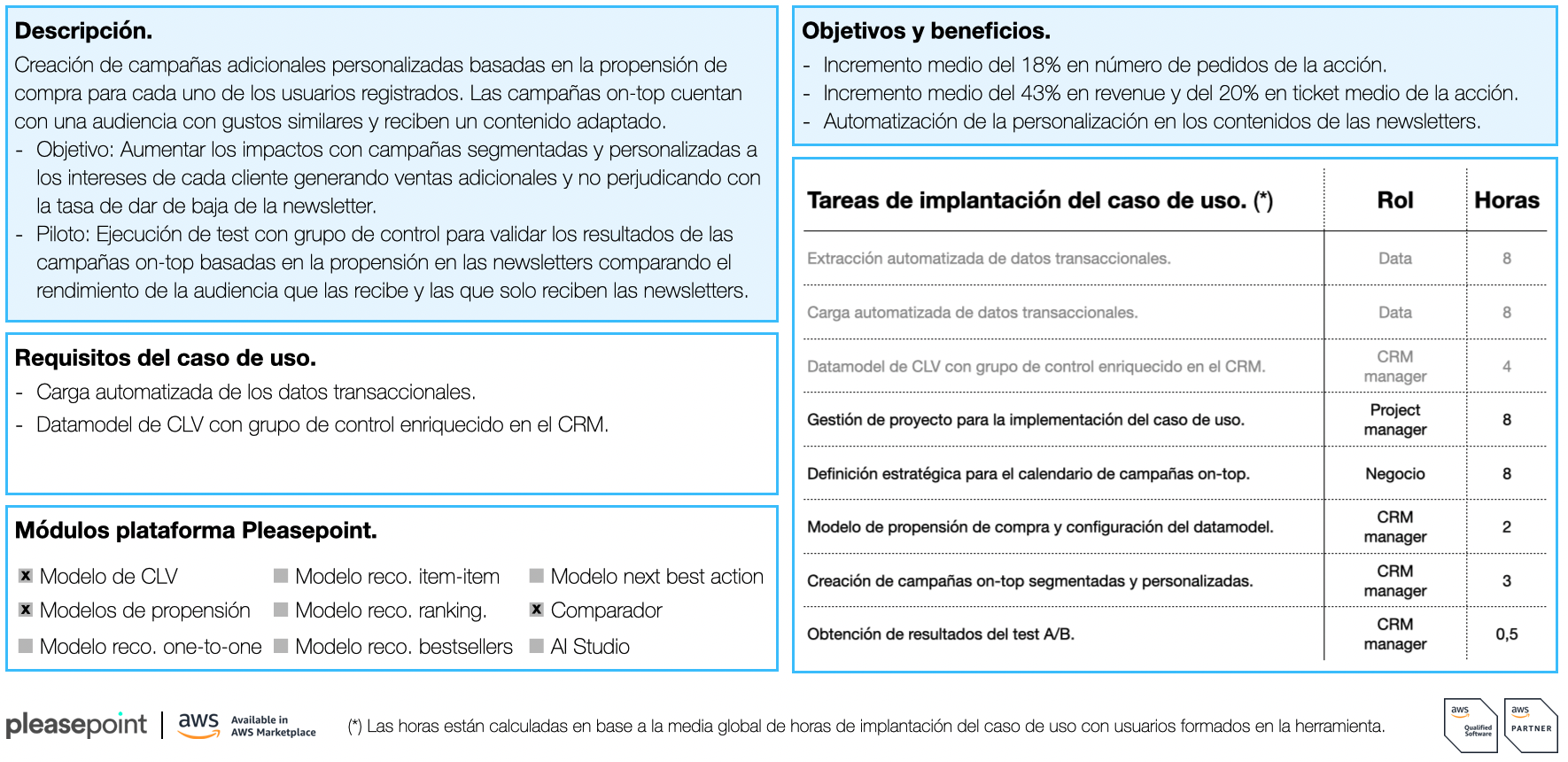 Piloto: Piloto: Se ejecuta un test A/B para validar los resultados de la predicción de la siguiente compra de Pleasepoint, comparando con los resultados de la comunicación genérica para todos los clientes.