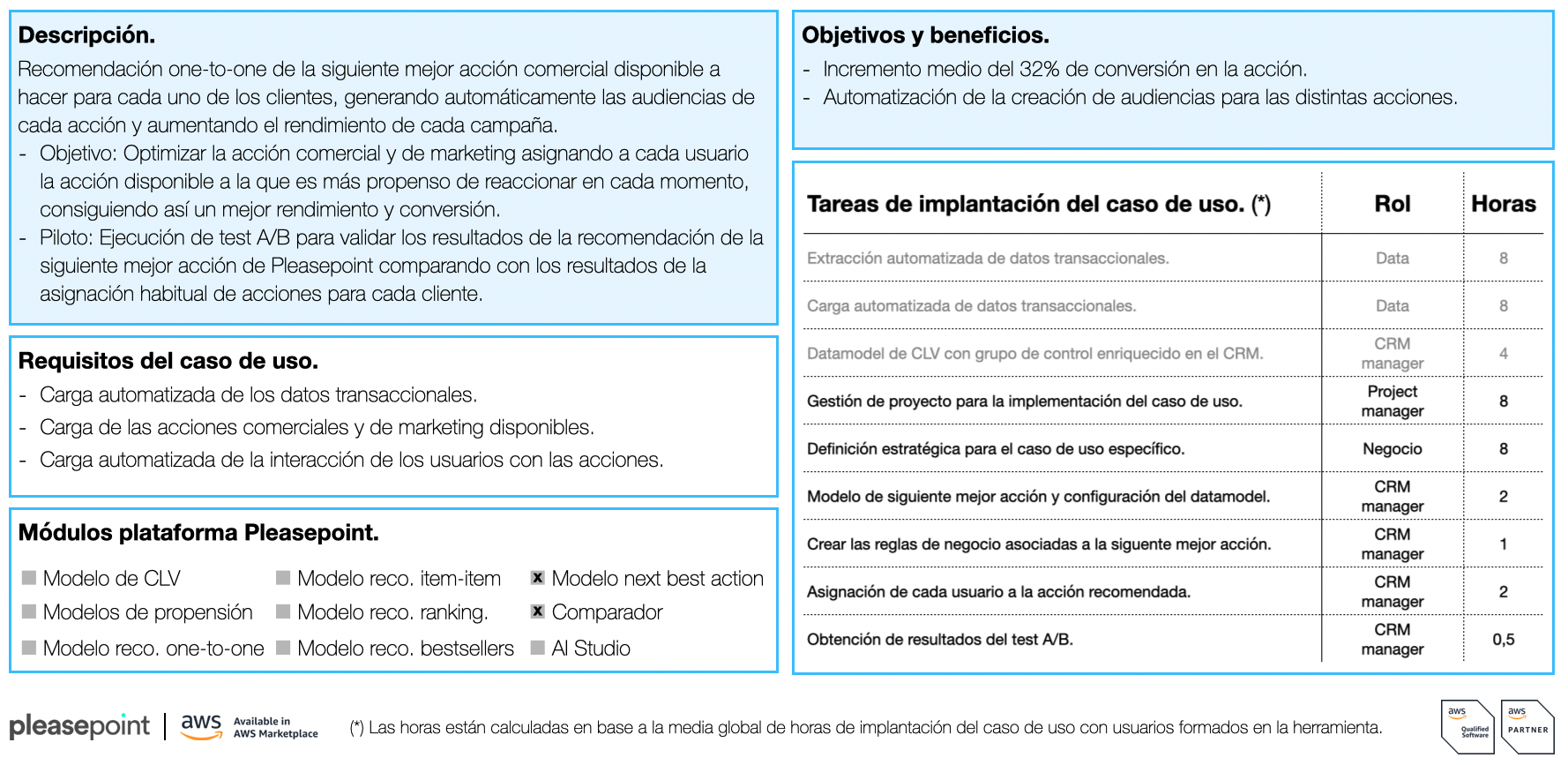 Piloto: Se ejecuta un test A/B para validar los resultados de la recomendación de la siguiente mejor acción de Pleasepoint, comparando con los resultados de la asignación habitual de acciones para cada cliente.