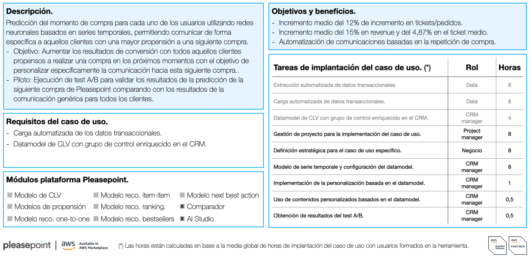 La predicción del momento de compra para cada usuario utiliza redes neuronales basadas en series temporales, permitiendo comunicar de forma específica a aquellos clientes con mayor propensión a realizar una compra.