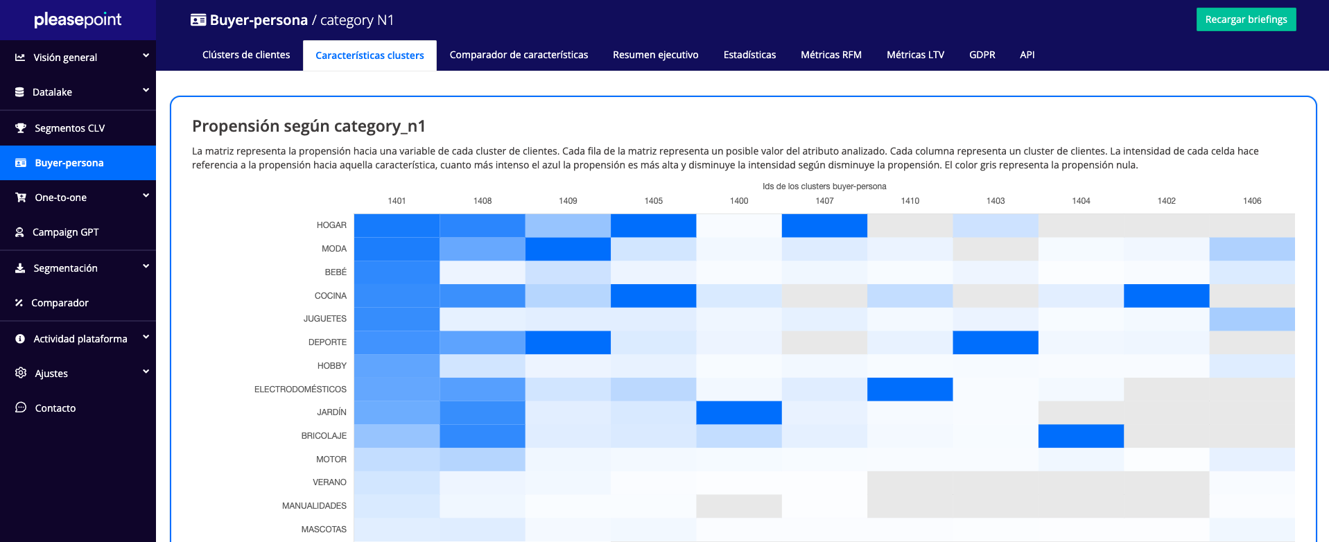 En este ejemplo puedes ver distintos grupos de clientes que comparten afinidad hacia las mismas categorías de productos. Para ver la gráfica, en cada columna tienes un cluster de clientes y en cada fila una categoría de productos. La intensidad de cada una de las celdas te idenfican una mayor propensión de compra de esos clientes hacia aquella categoría de productos.