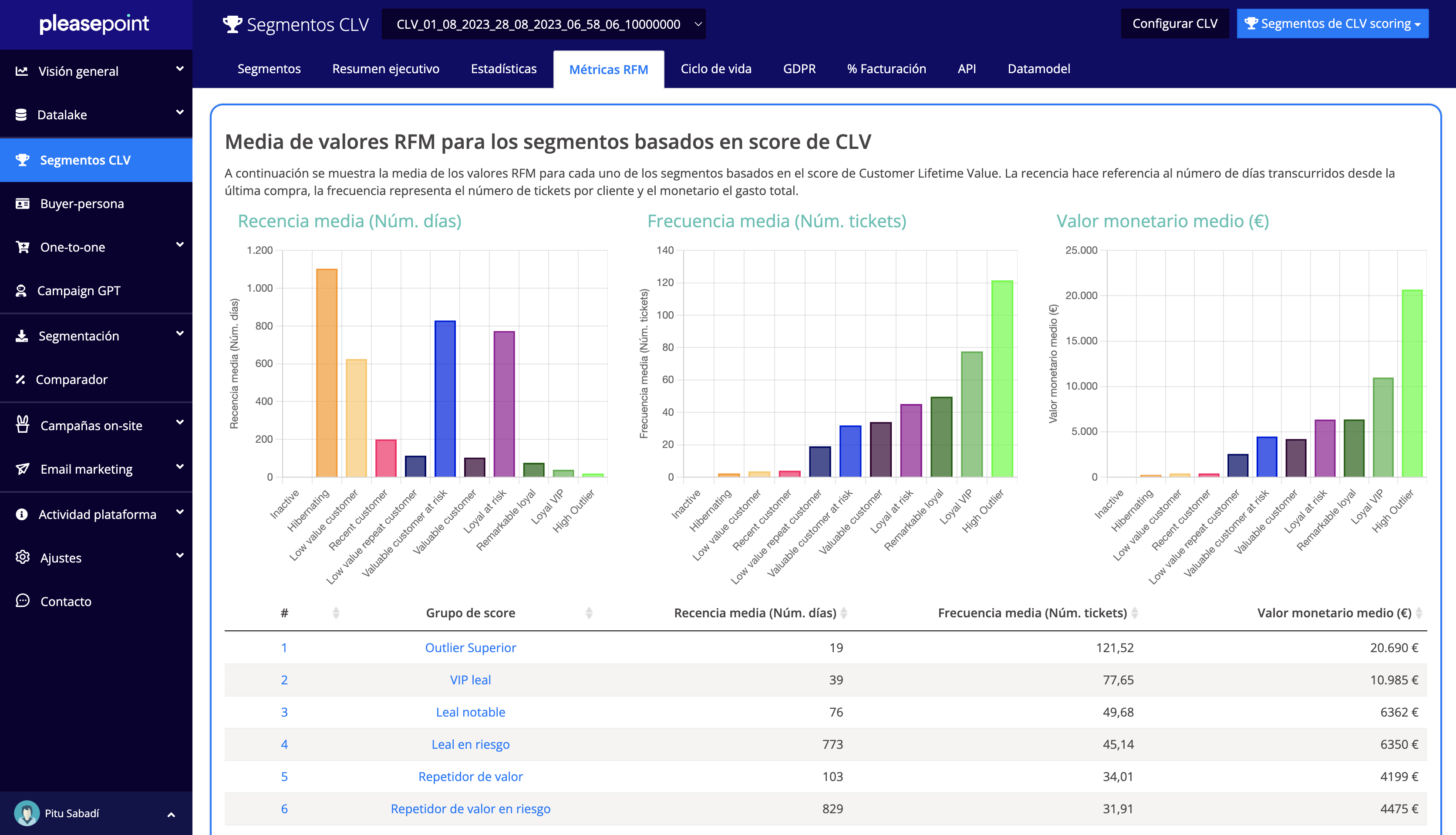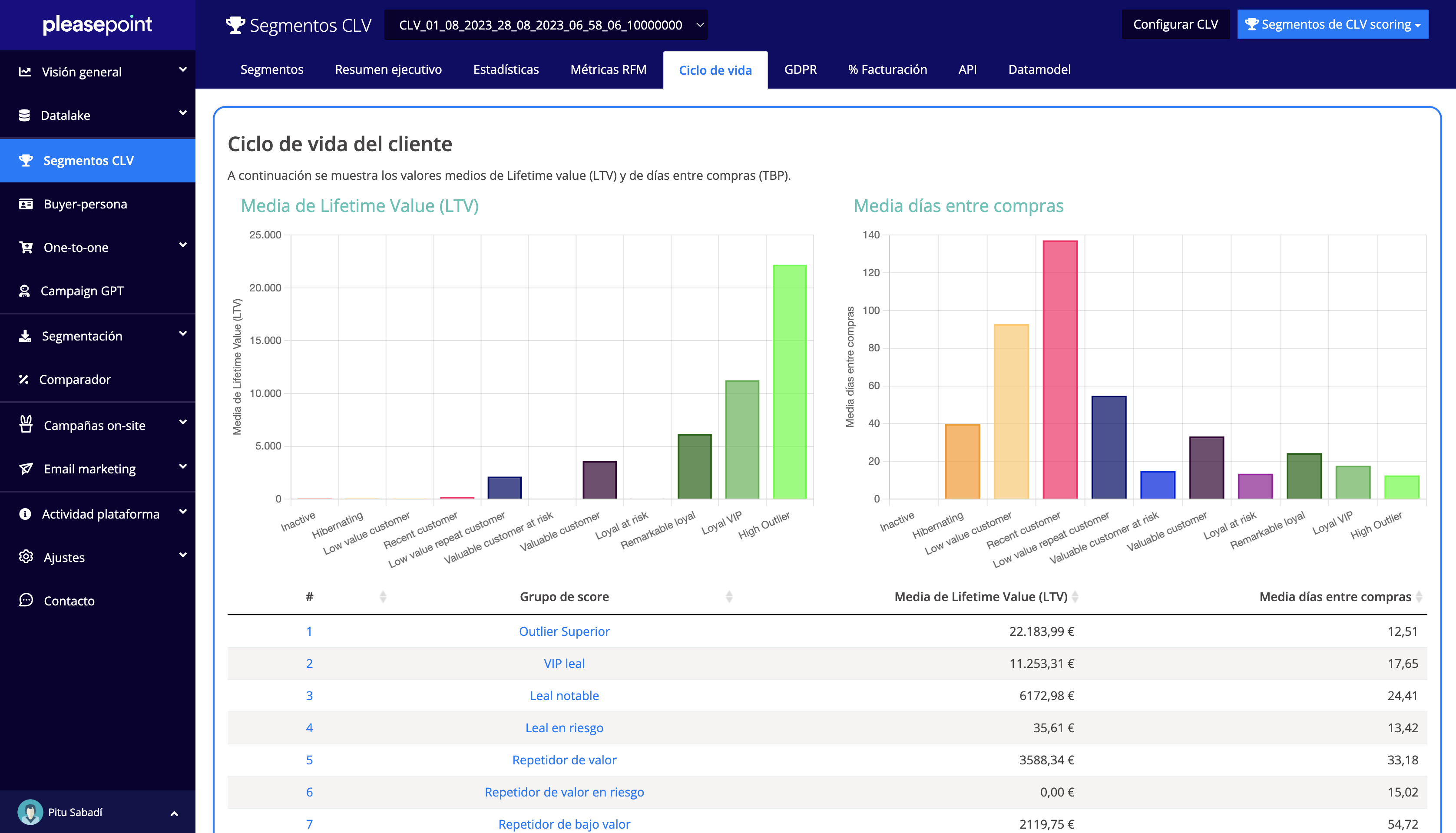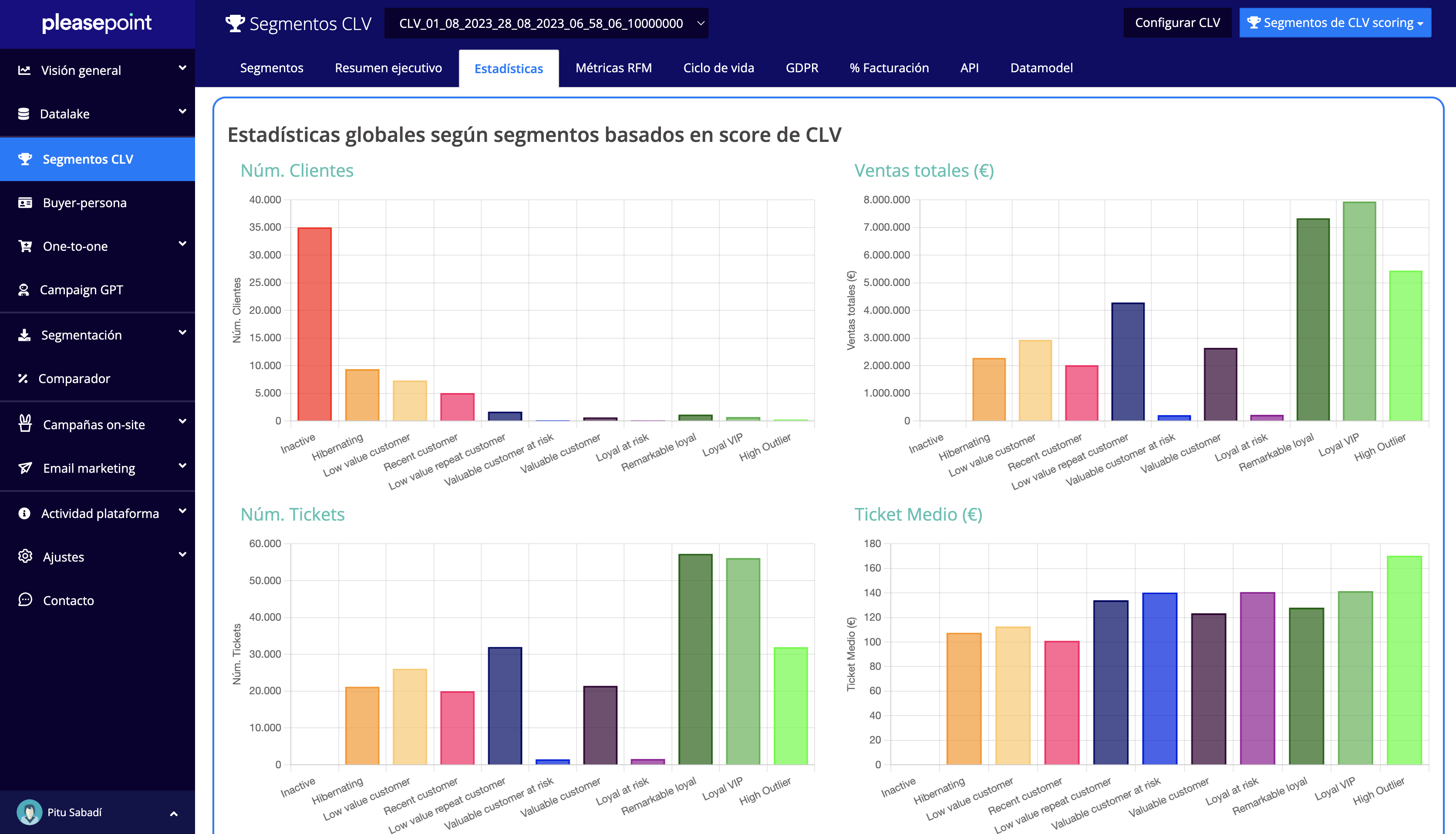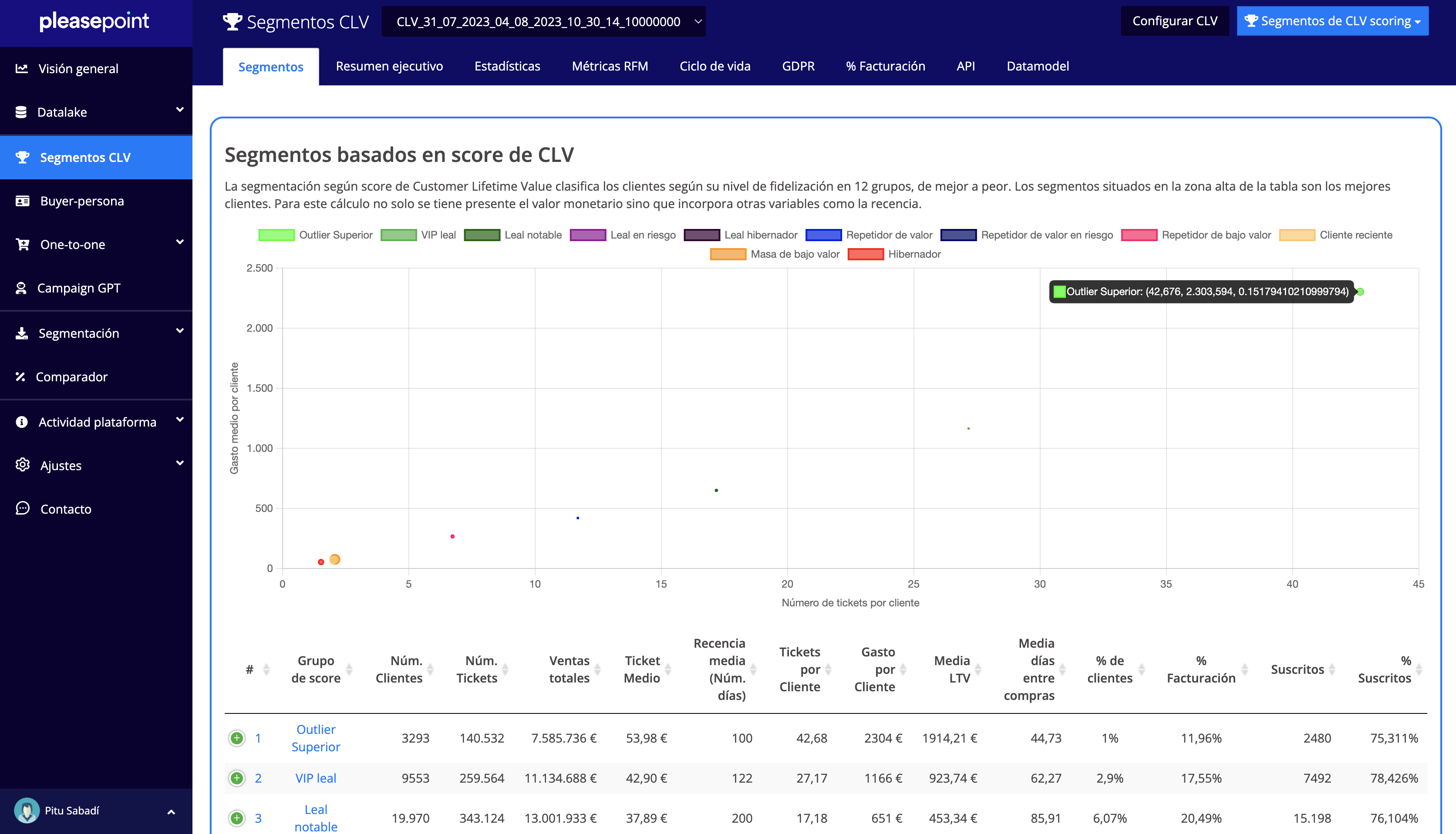 La clasificación de clientes en base al Customer Lifetime Value (CLV) es una estrategia poderosa que arroja una luz reveladora sobre la relación entre tus clientes y tu negocio. Los Datamodels de Pleasepoint, nacidos de los resultados de nuestros modelos de inteligencia artificial, se transforman en mapas detallados que guían a través de los diferentes niveles de fidelización de los clientes.