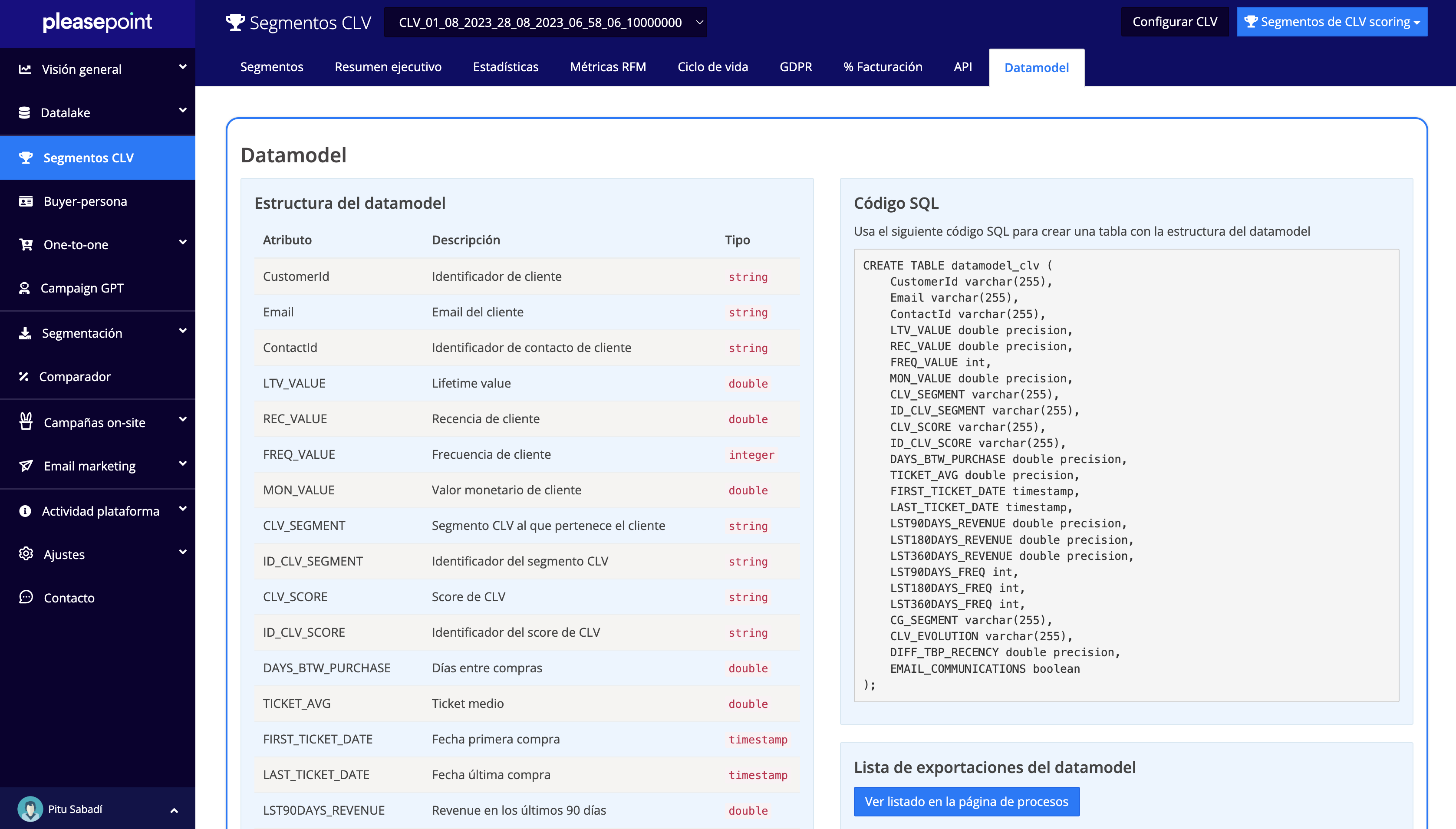 En el ecosistema de Pleasepoint, los Datamodels son archivos CSV generados de forma automatizada que permiten exportar y accionar los resultados generados por nuestros modelos de inteligencia artificial.