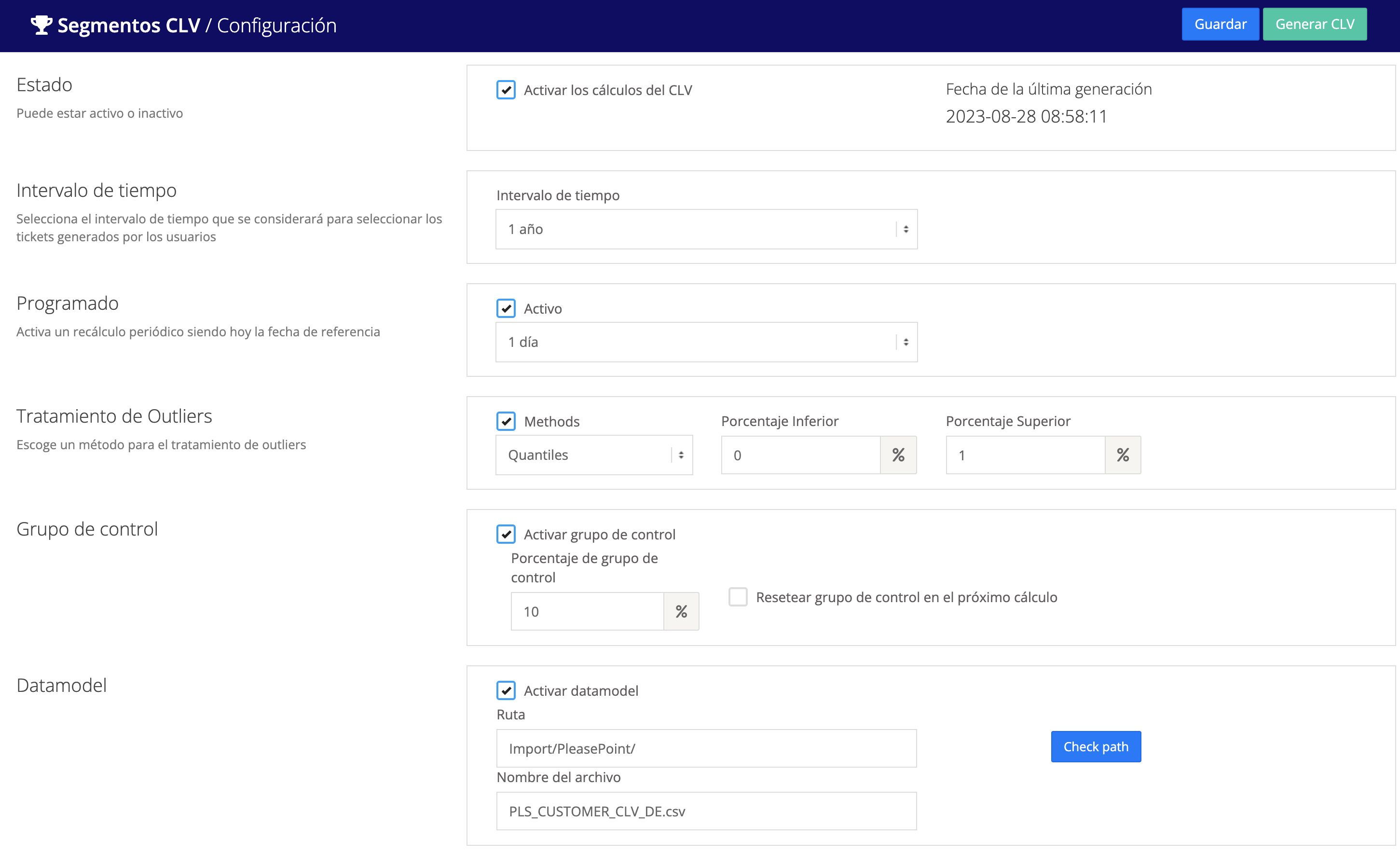 Una vez configurado correctamente el sFTP ya tienes acceso a la generación automatizada de la exportación de datos masiva de cada uno de los clientes en el apartado de Segmentación basada en Customer Lifetime Value.
