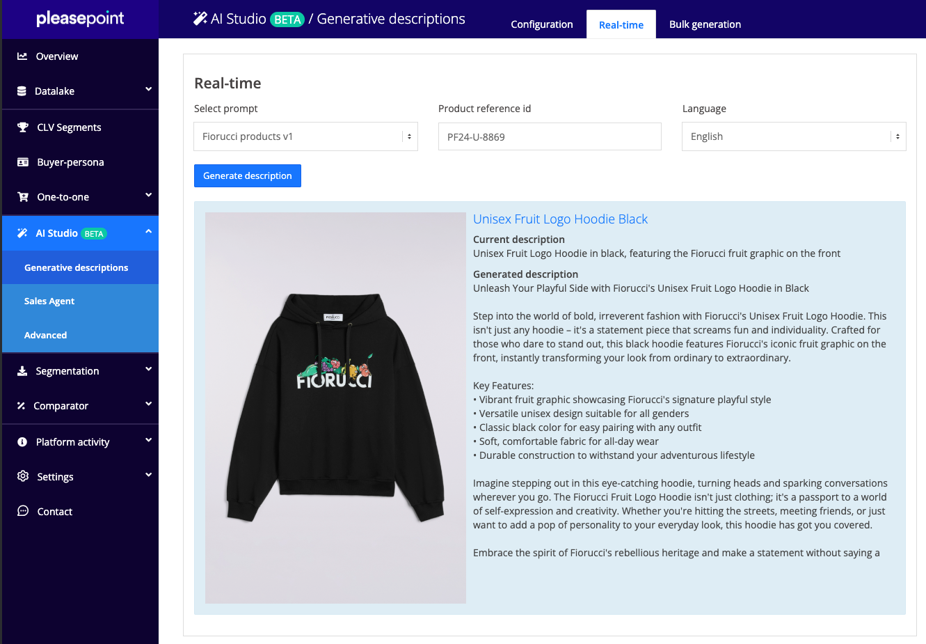 Pleasepoint Generative Descriptions lleva la automatización a otro nivel. Con esta herramienta, puedes generar descripciones personalizadas en 6 segundos por producto. Esto incluye adaptaciones al tono de voz de la marca, optimización para SEO y personalización basada en la audiencia y el idioma.