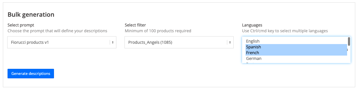 - Generación masiva: Si tienes un catálogo con cientos o miles de productos, esta funcionalidad permite generar descripciones para todos ellos de forma automática y eficiente. En cuestión de minutos, tendrás todo tu catálogo optimizado y listo para captar la atención de los clientes.
