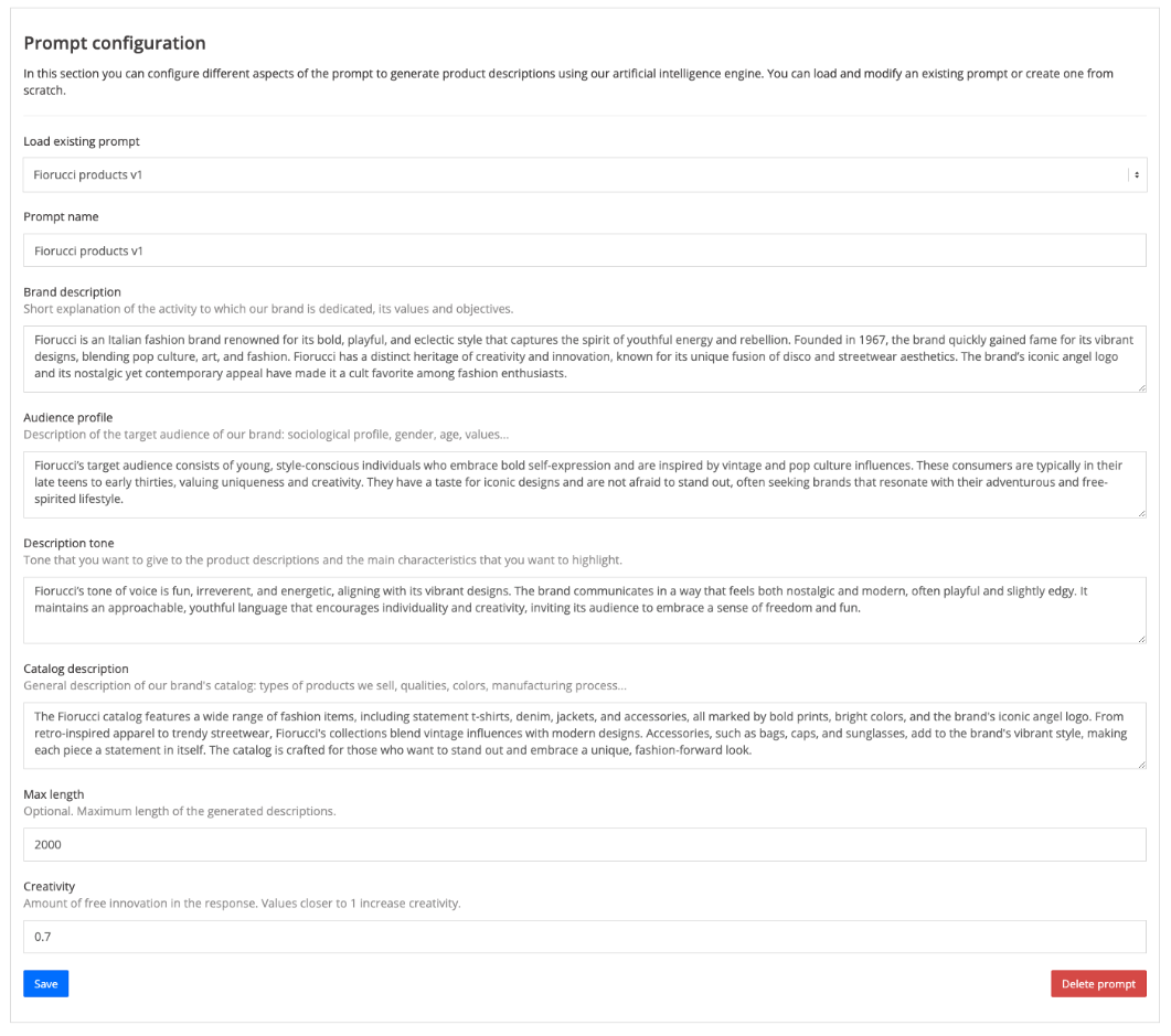 Pleasepoint GD te permite guardar múltiples prompts personalizados, adaptados a diferentes públicos, categorías o marcas de productos. Esto te da total flexibilidad para ajustar las descripciones según tus necesidades en cada momento, optimizando cada texto para su objetivo específico.