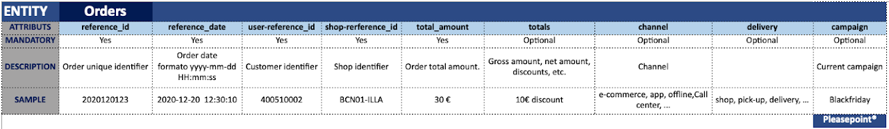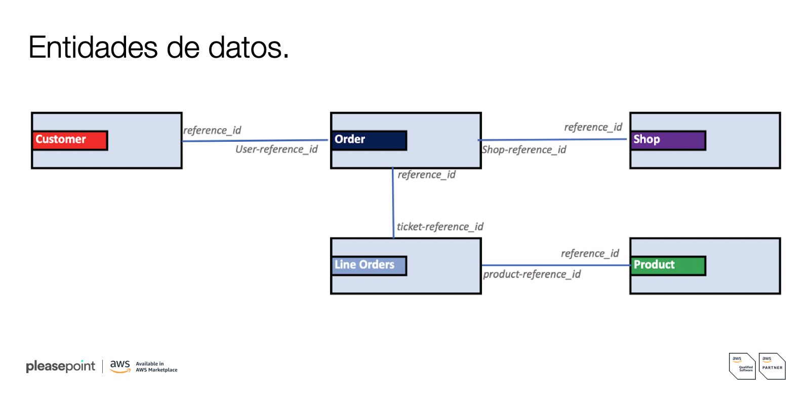 Pleasepoint utiliza el histórico de los datos transaccionales para entender los patrones de compra y la propensión de compra de cada uno de los clientes. Para ello utiliza 5 entidades de datos: