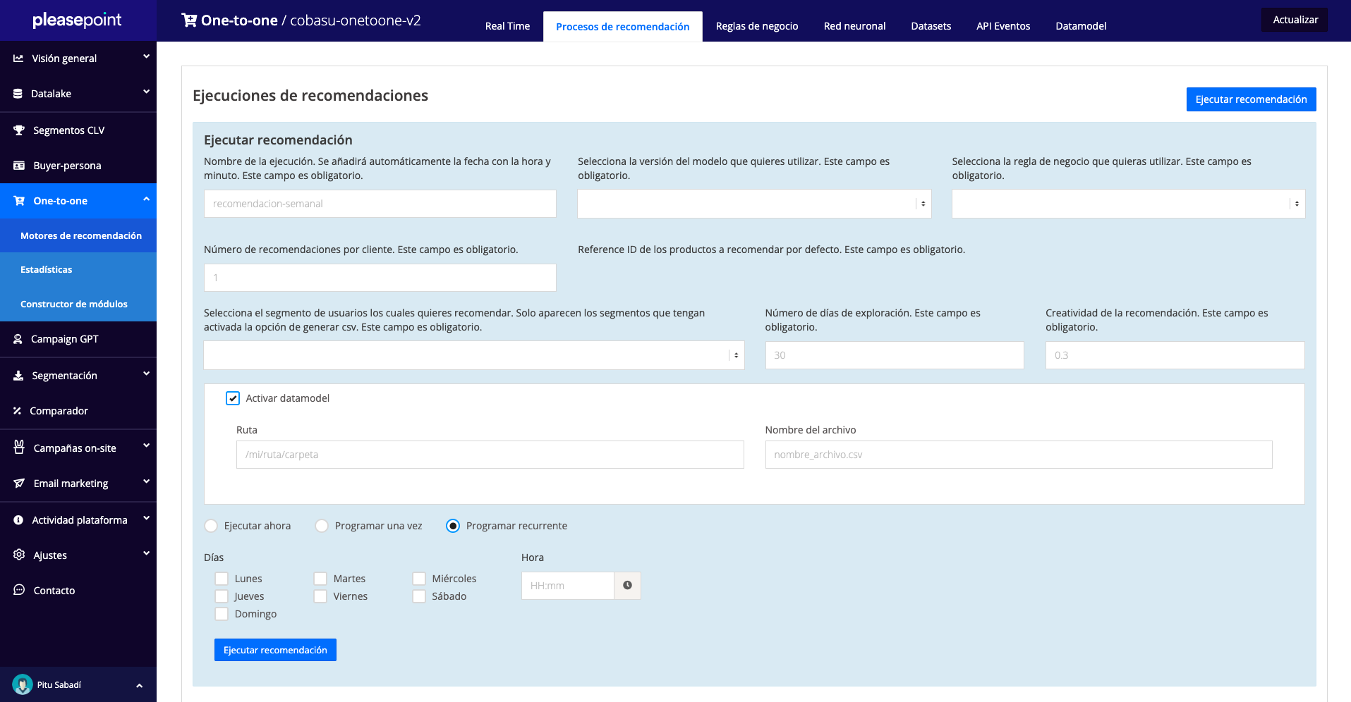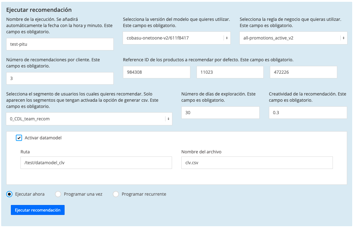- Definir si queremos que la recomendación se ejecute ahora, dejarla programada o tener una ejeción recurrente.