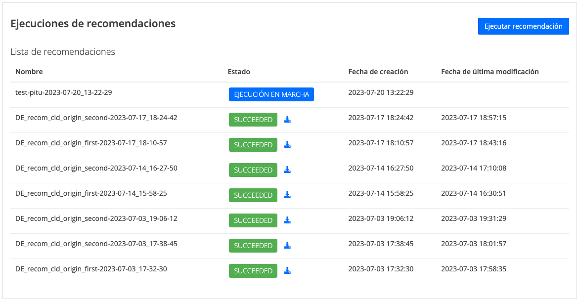 Una vez completados estos pasos verás el nuevo proceso de recomendación y su estado en la lista de ejecuciones.