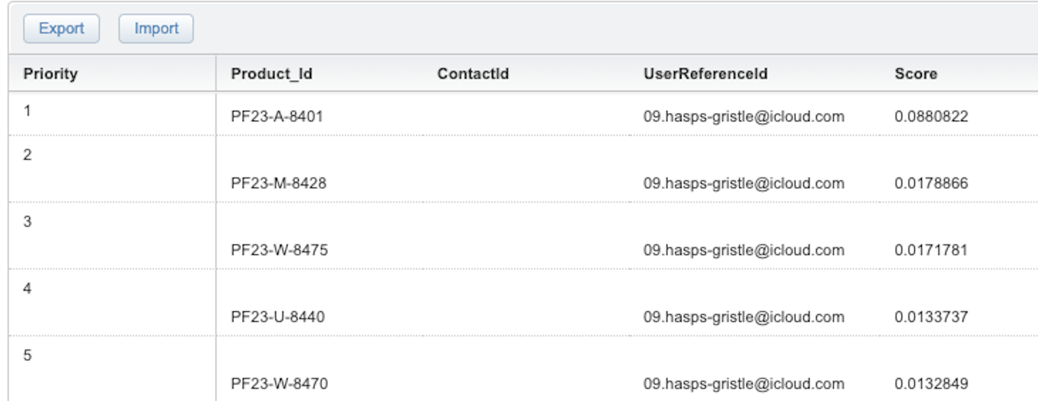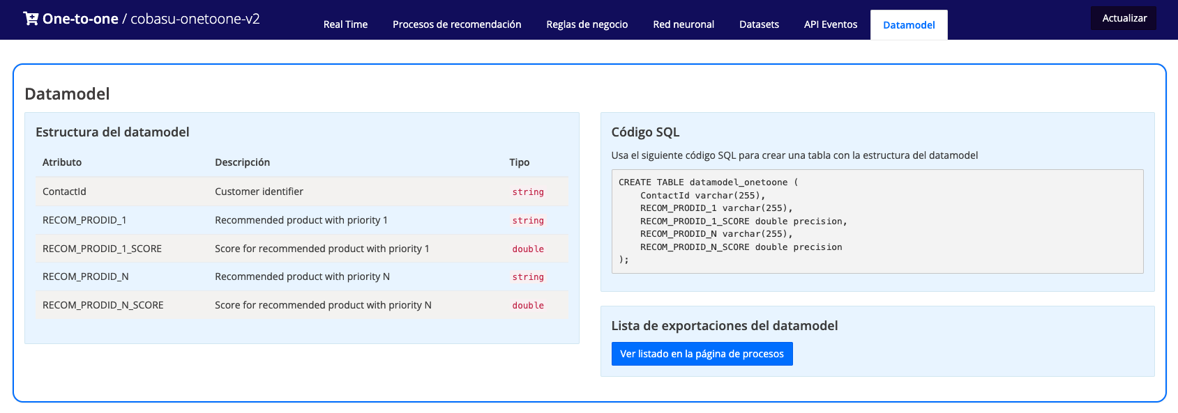 El data model resultante te lo entregamos en un archivo CSV en el sFTP que tengas configurado en plataforma. Este archivo siempre tendrá la misma estructura. La tienes definida en la sección de Datamodel en el motor de recomendación.