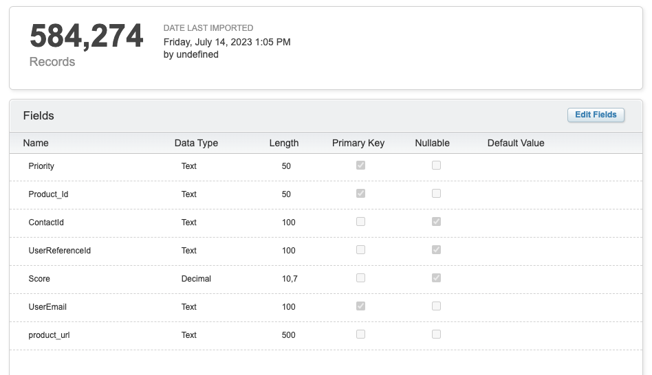 Primero necesitas crear la Data Extension en Salesforce Marketing Cloud con la estructura que necesitarás. De esta forma, si siempre utilizas 8 recomendaciones de productos creas la DE con la estructura para 8 productos.