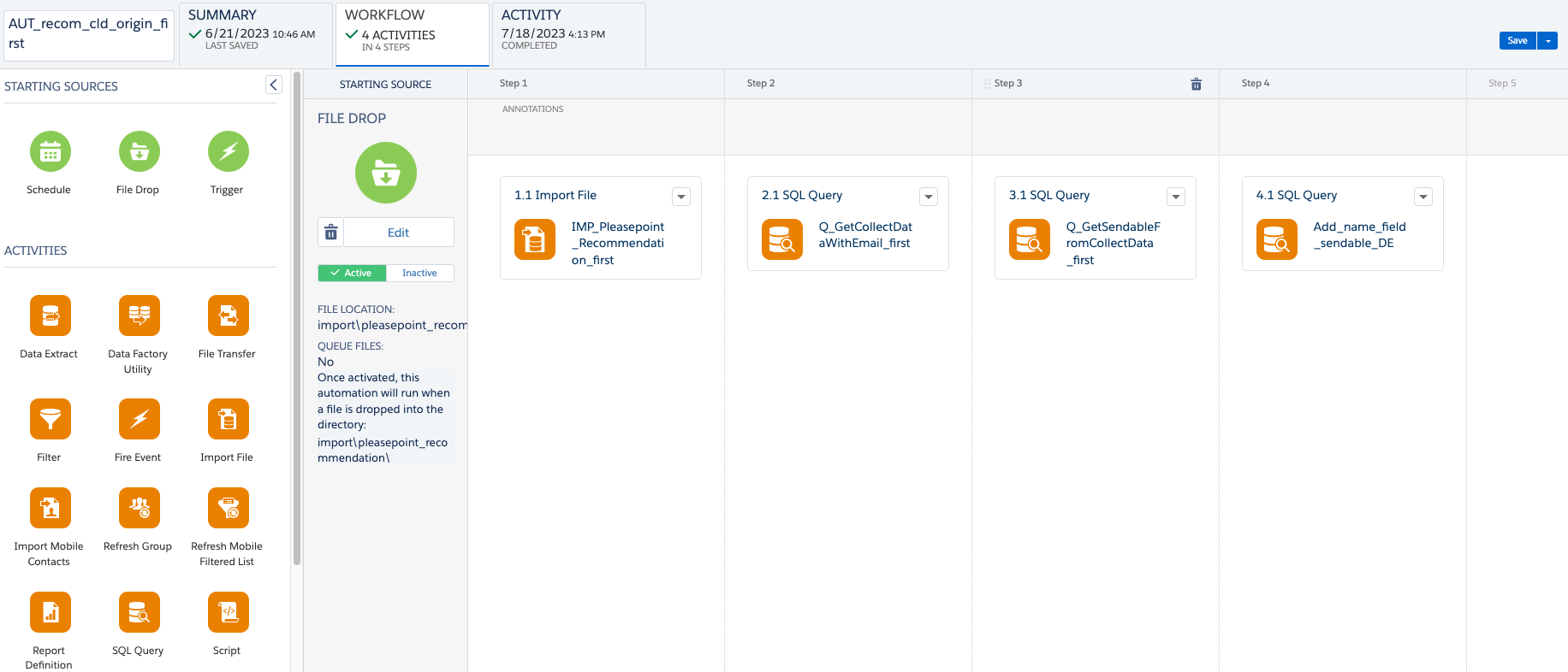 Así pues tenemos en Salesforce Marketing Cloud una automation que rellena la data extension con las recomendaciones personalizadas para cada cliente.