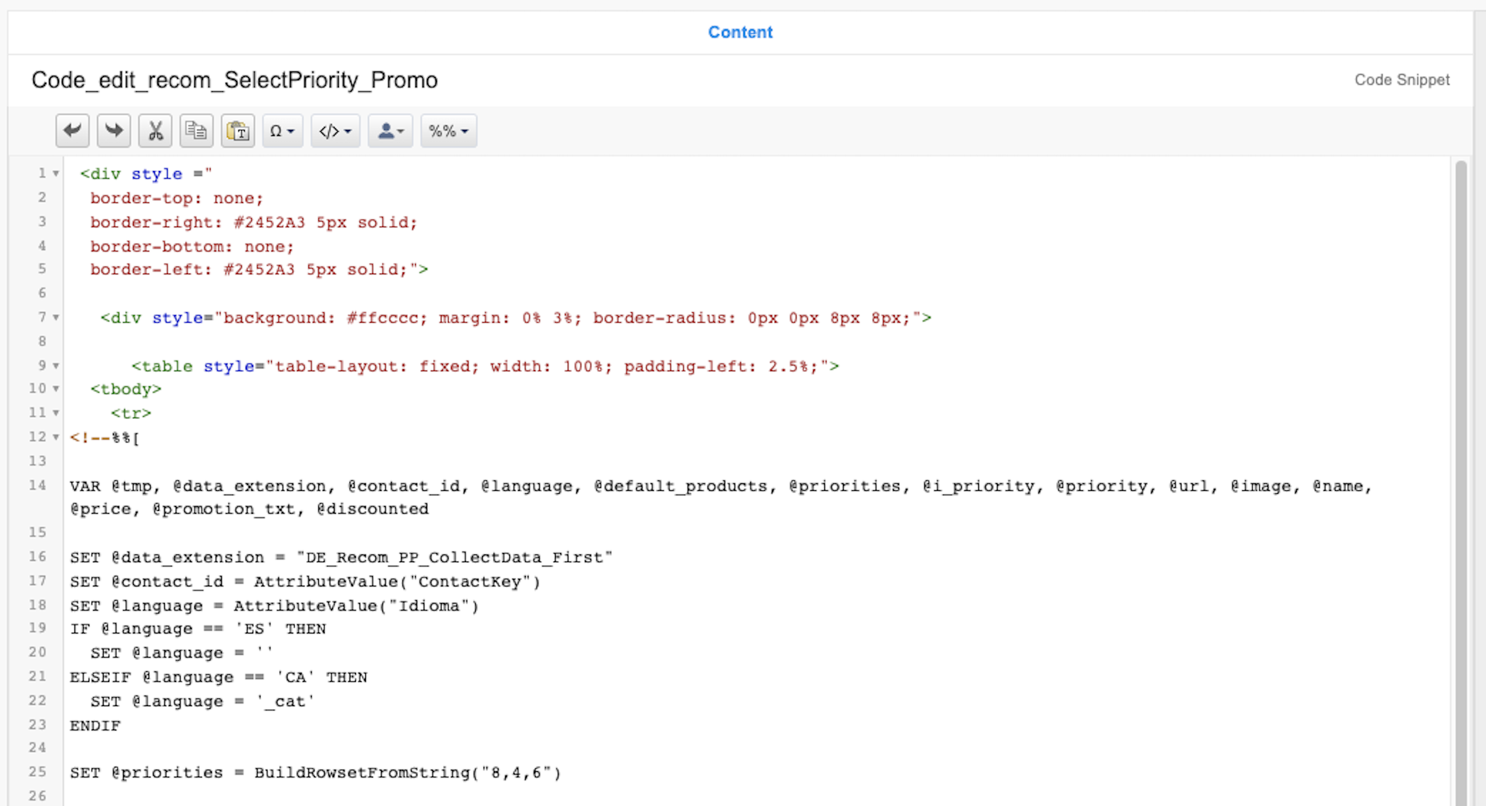 Finalmente, para mostrar los productos recomendados en nuestras acciones, utilizaremos AMP Script en el template de las newsletters.