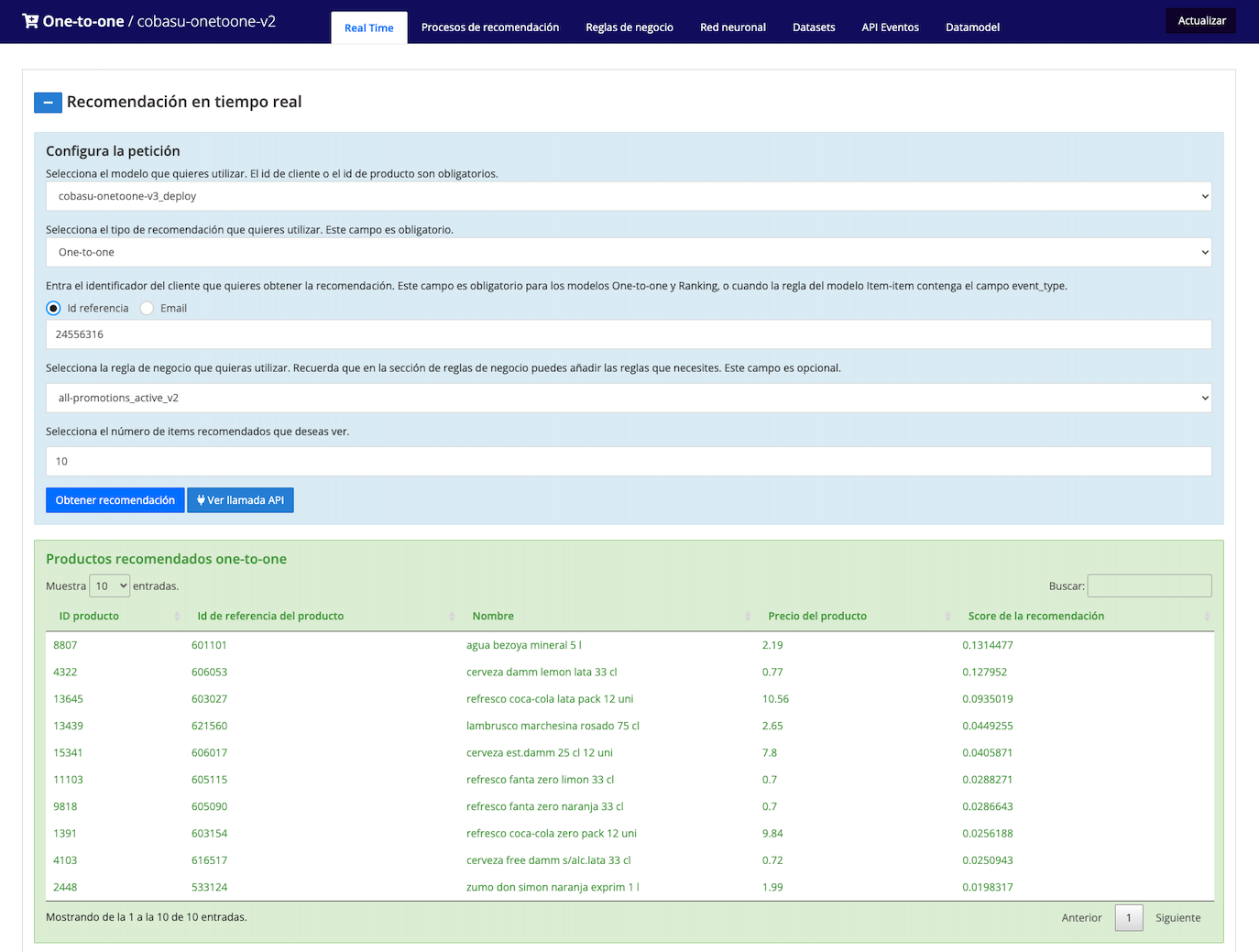 La recomendación one-to-one devuelve una lista de productos y cada producto con un score asociado para ese usuario.