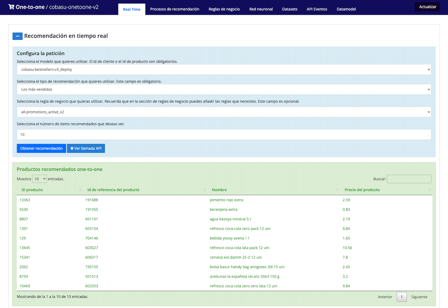 En la recomendación one-to-one el modelo entrenado responde en tiempo real con los productos más adecuados dado un produto y una regla de negocio.