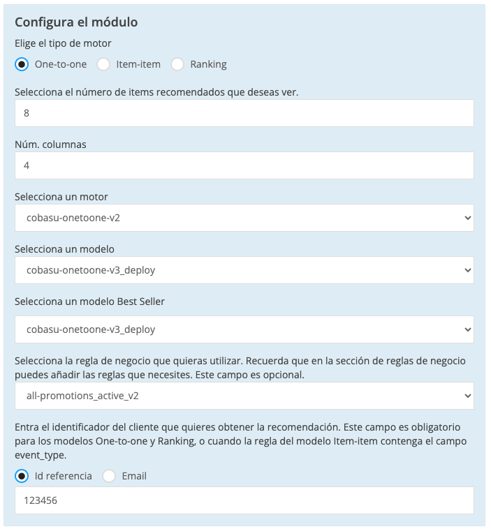 Para facilitarte el uso del SDK en HTML en la propia plataforma puedes configurar tu widget de recomendación en la sección Constructor de módulos en el módulo de One-to-one.