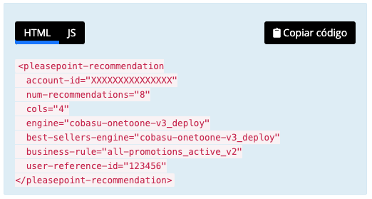 Este es el código HTML que debes incrustar en el espacio donde quieras mostrar la recomendación one-to-one.