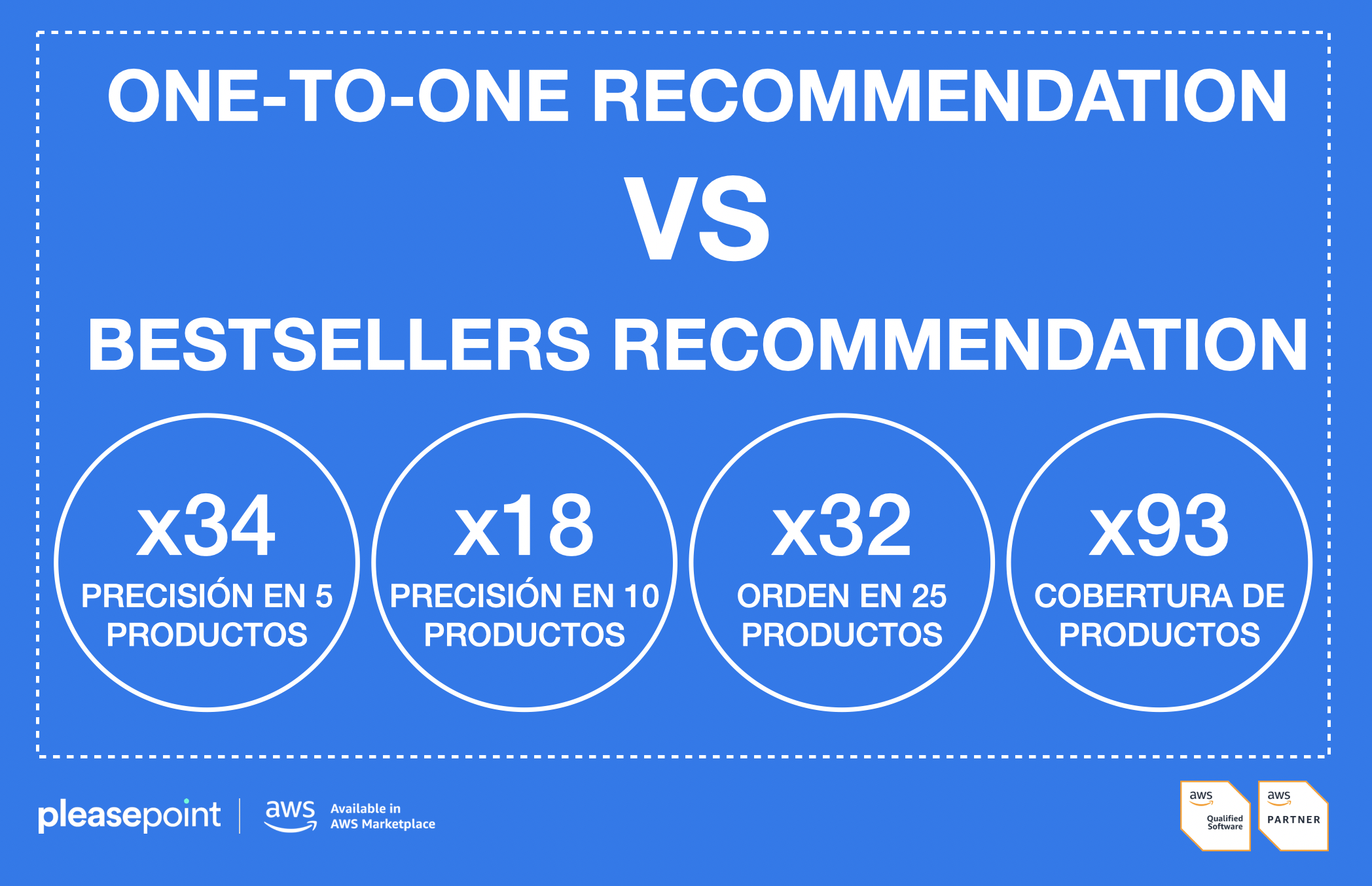 - Precisión a 5 productos: La recomendación one-to-one mostró una mejora de x34,45 en comparación con los bestsellers.