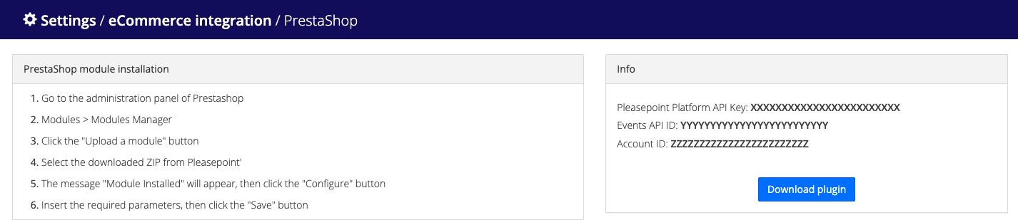 Para que todo funcione correctamente, es necesario que conectes tu cuenta de Pleasepoint con PrestaShop. Este paso es bastante sencillo y solo requiere que tengas a mano las API keys y el identificador de cuenta que encontrarás en la misma página donde has descargado el módulo para instalar (Configuración > Integración eCommerce > PrestaShop).