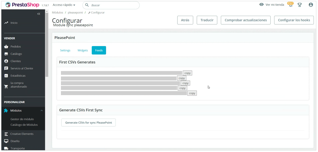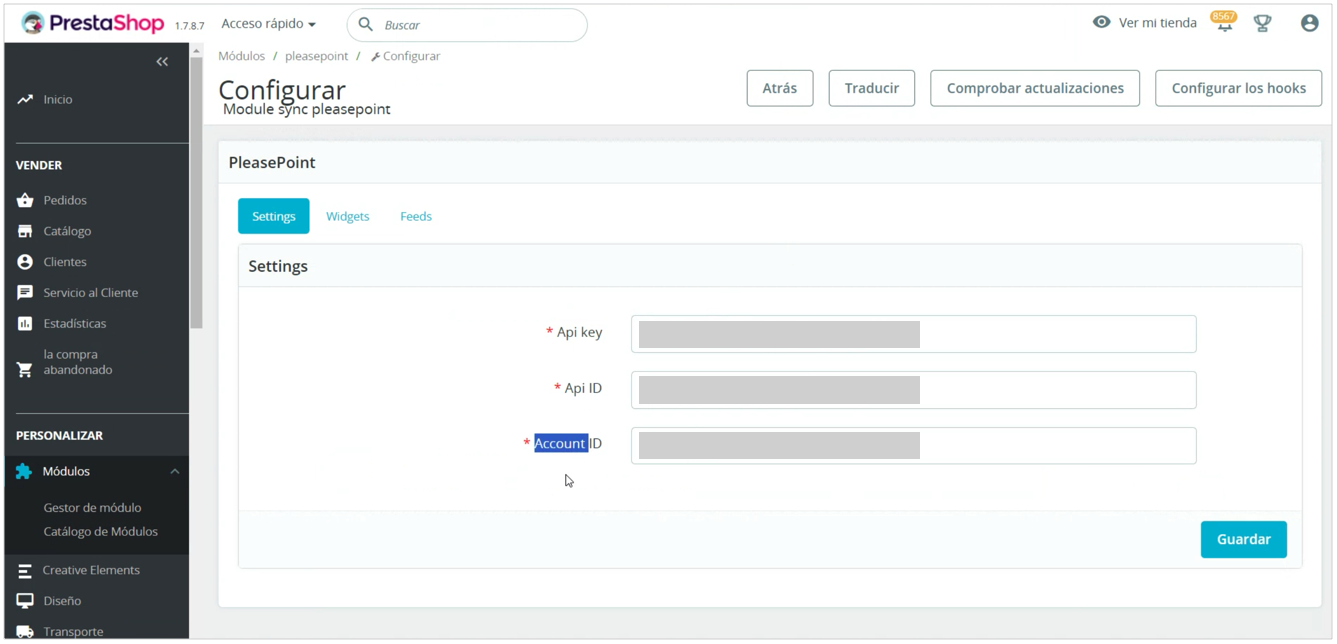 En el backoffice de PrestaShop entra a la configuración del módulo de Pleasepoint. En la primera pestaña debes copiar y pegar los valores que permiten conectar con tu cuenta.