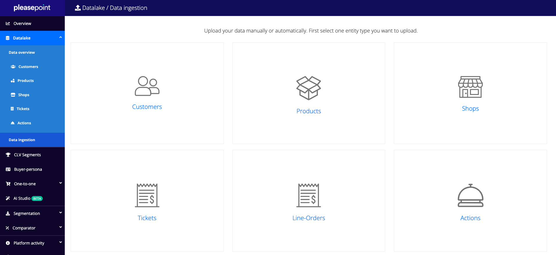 - Ingesta de histórico de datos: Permite la carga automatizada de todo el histórico de datos transaccionales, como clientes, productos, tickets y líneas de ticket. De esta manera, todo lo que necesitas para comenzar a personalizar está centralizado en Pleasepoint, sin necesidad de procesos manuales.