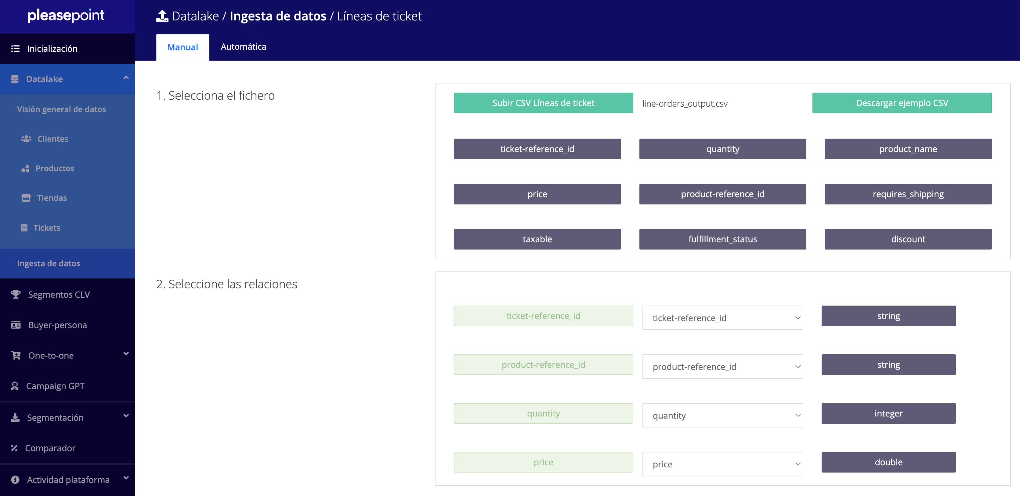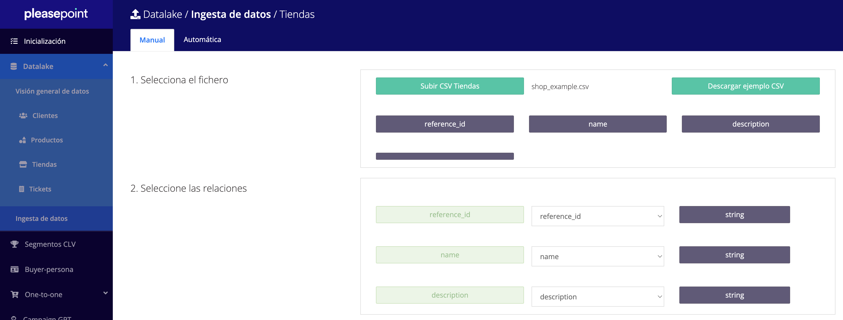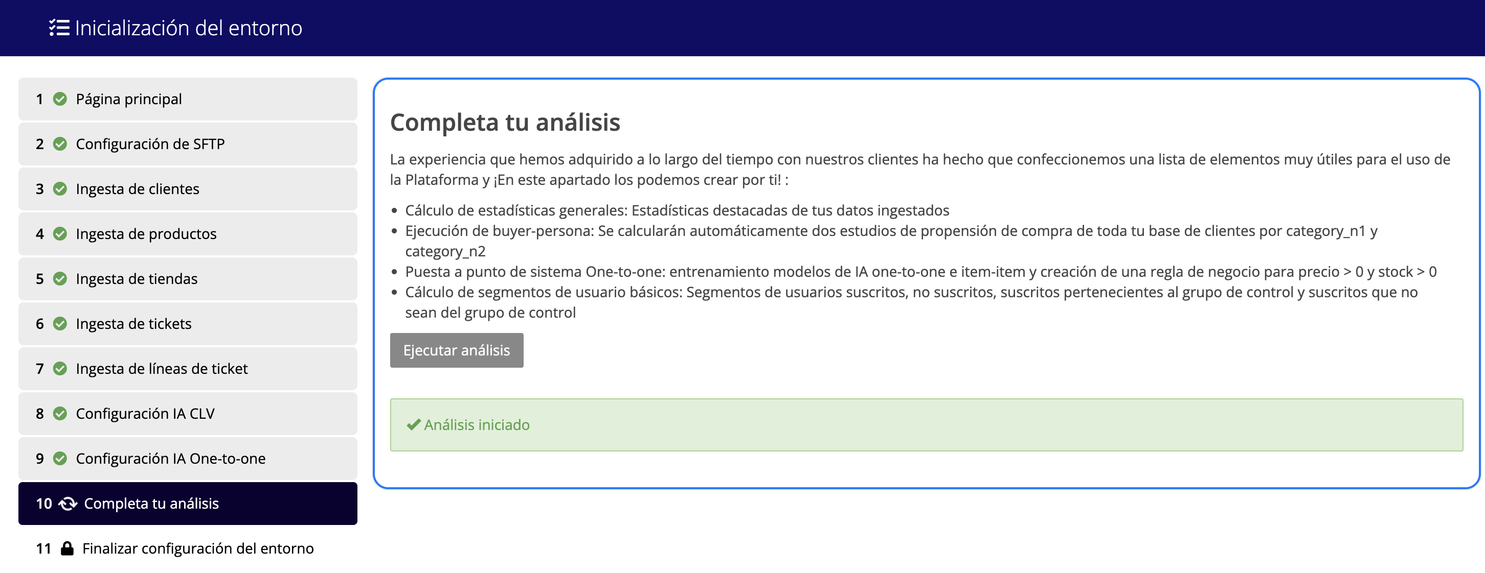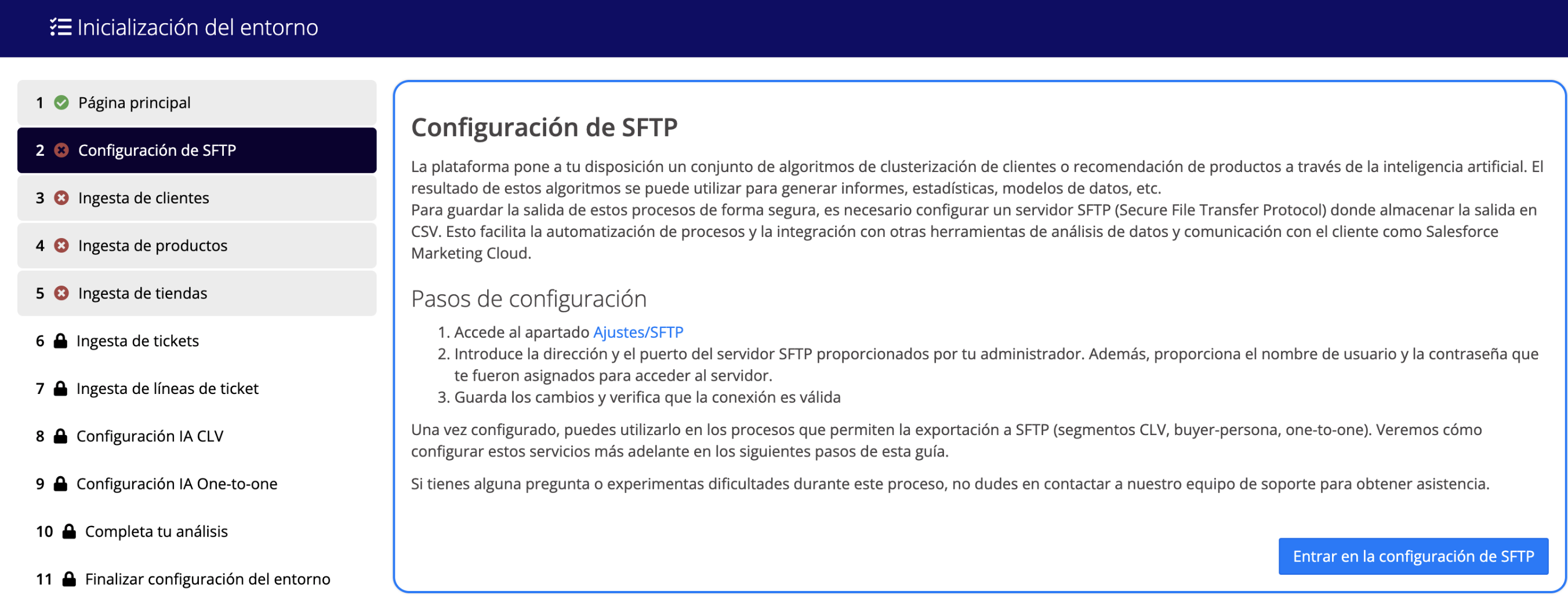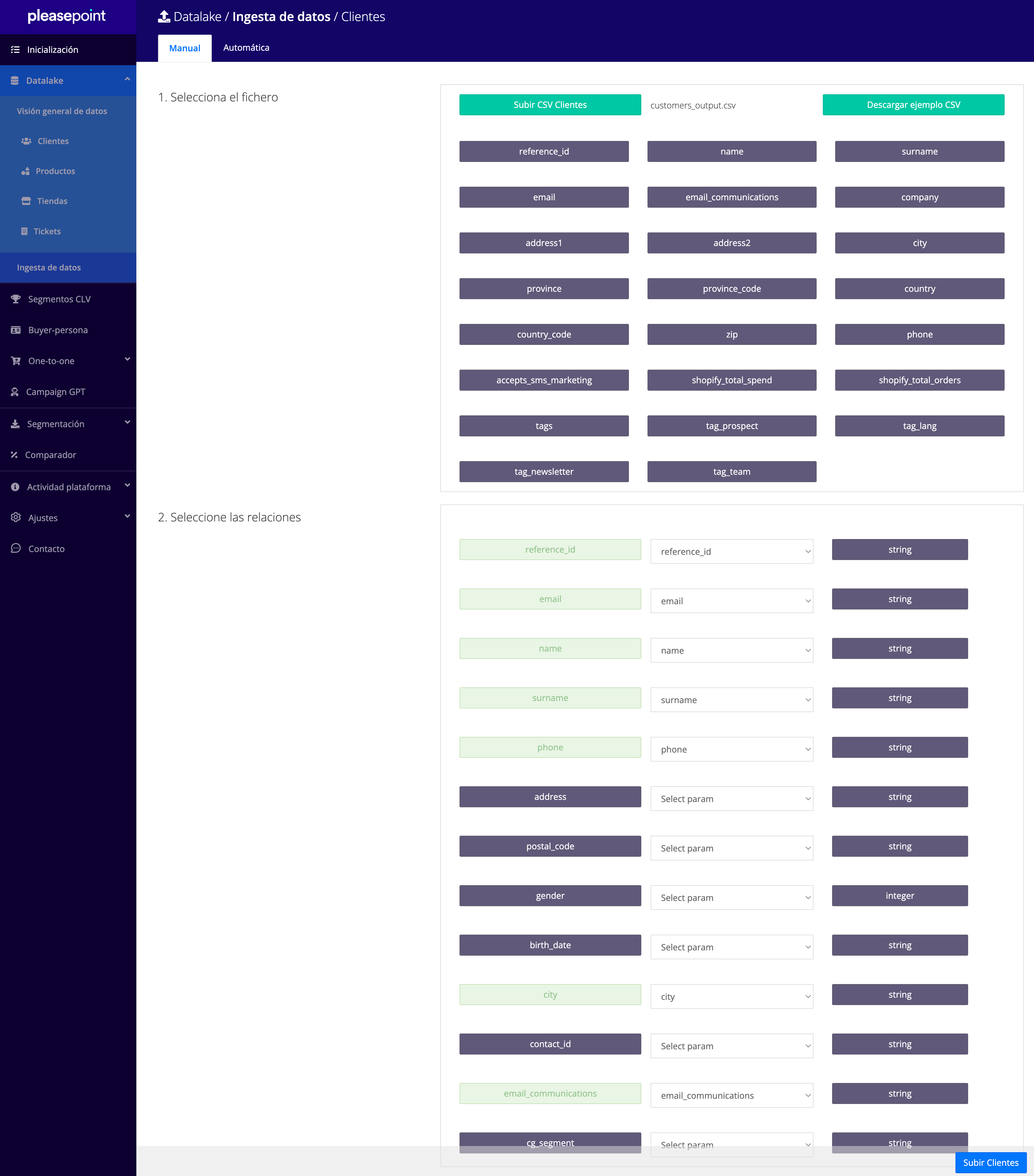 Puedes cargar los datos manualmente o asignar una carpeta dentro de tu servidor sFTP para que la plataforma los cargue automáticamente. La carga inicial de clientes es un paso crucial, ya que son la base de tus análisis.
