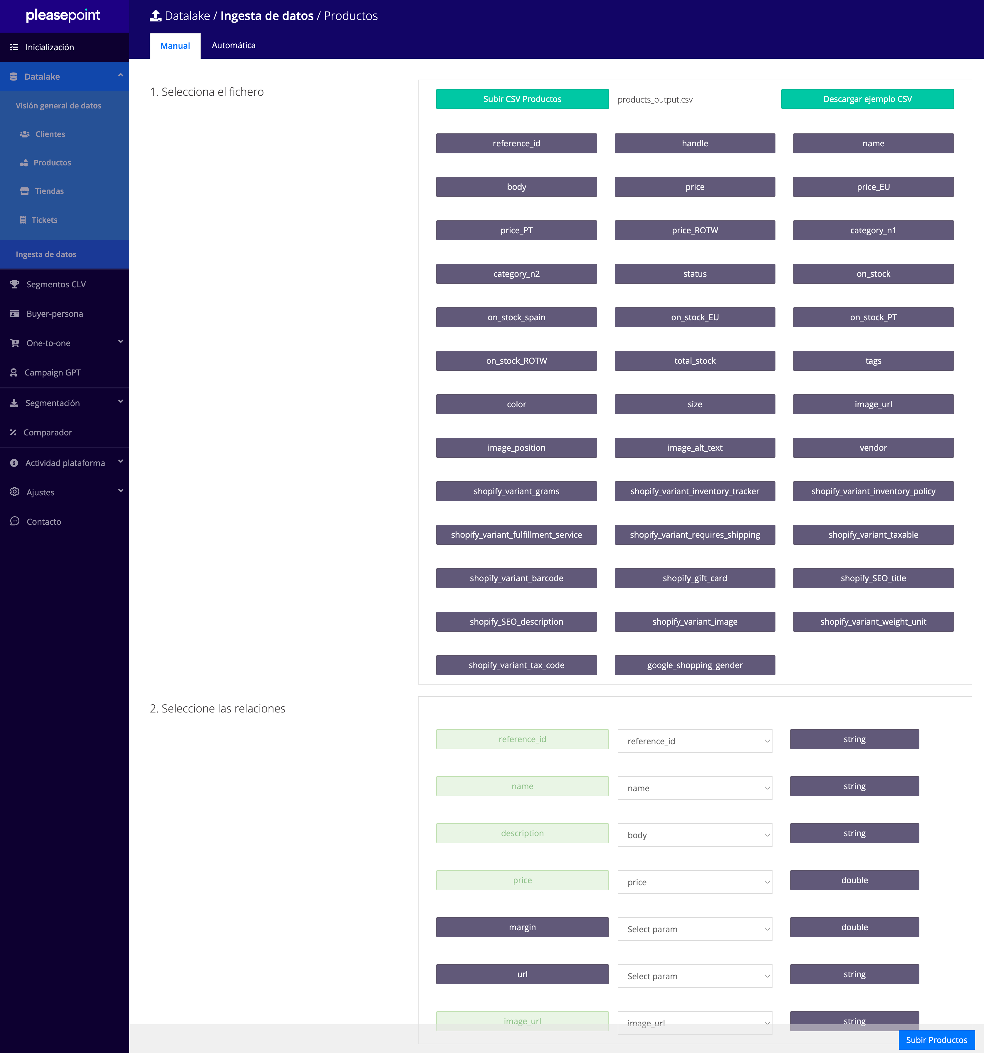 Los productos son esenciales en cualquier plataforma de CRM. La carga de tu catálogo de productos es imprescindible para operar con éxito en Pleasepoint. Es conveniente cargar el catálogo histórico de productos y no solamente el feed de productos con los productos actualmente disponibles.