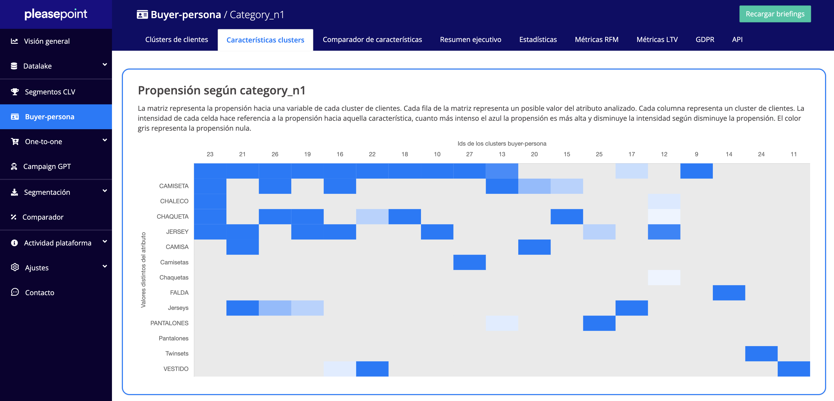Aquí, Pleasepoint te ofrece dos modelos de propensión de compra. El primer nivel de categorías de productos te ayuda a comprender qué categorías de productos son más propensas a atraer a ciertos grupos de clientes. El segundo nivel profundiza aún más en las preferencias de compra de tus clientes, lo que te permite crear audiencias con propensiones de compra similares y dirigirlas hacia categorías de productos específicas.