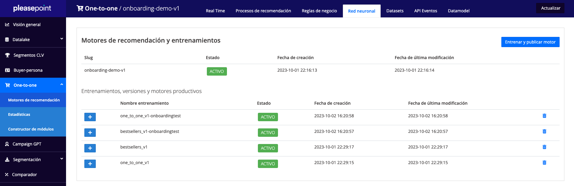 Al finalizar el proceso de onboarding en Pleasepoint, se despliegan ante ti una serie de modelos de inteligencia artificial listos para ser utilizados tanto en la segmentación de clientes como en interacciones en tiempo real. Estos modelos están diseñados para ayudarte a impulsar tu estrategia de marketing predictivo y te permiten tomar decisiones más fundamentadas.