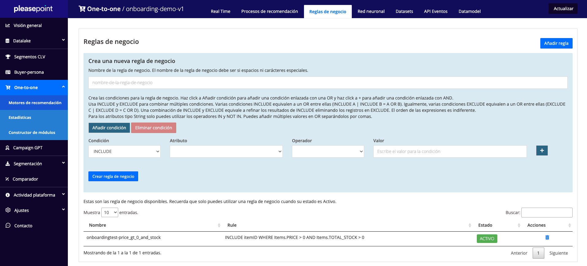 También tienes creada una primera regla de negocio para la recomendación de productos. Recuerda que puedes utilizar las reglas de negocio para orientar la estrategia comercial de las recomendaciones.
