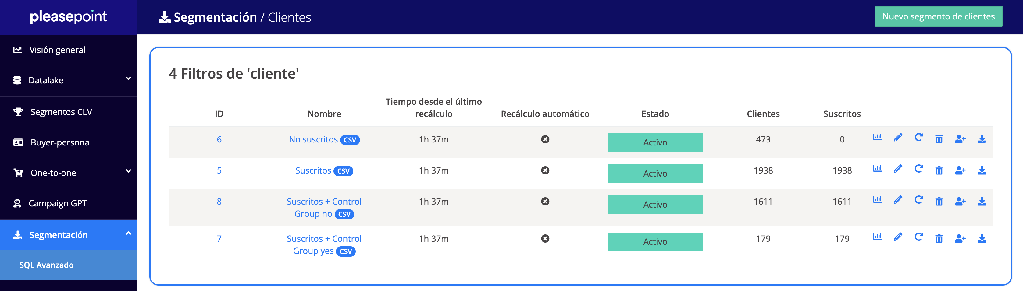 Además de los modelos anteriores, Pleasepoint proporciona segmentos predefinidos para simplificar tu estrategia. Estos segmentos incluyen suscritos, no suscritos, suscritos grupo de control no (audiencia impactable) y suscritos grupo de control sí (audiencia que actúa como grupo de control).