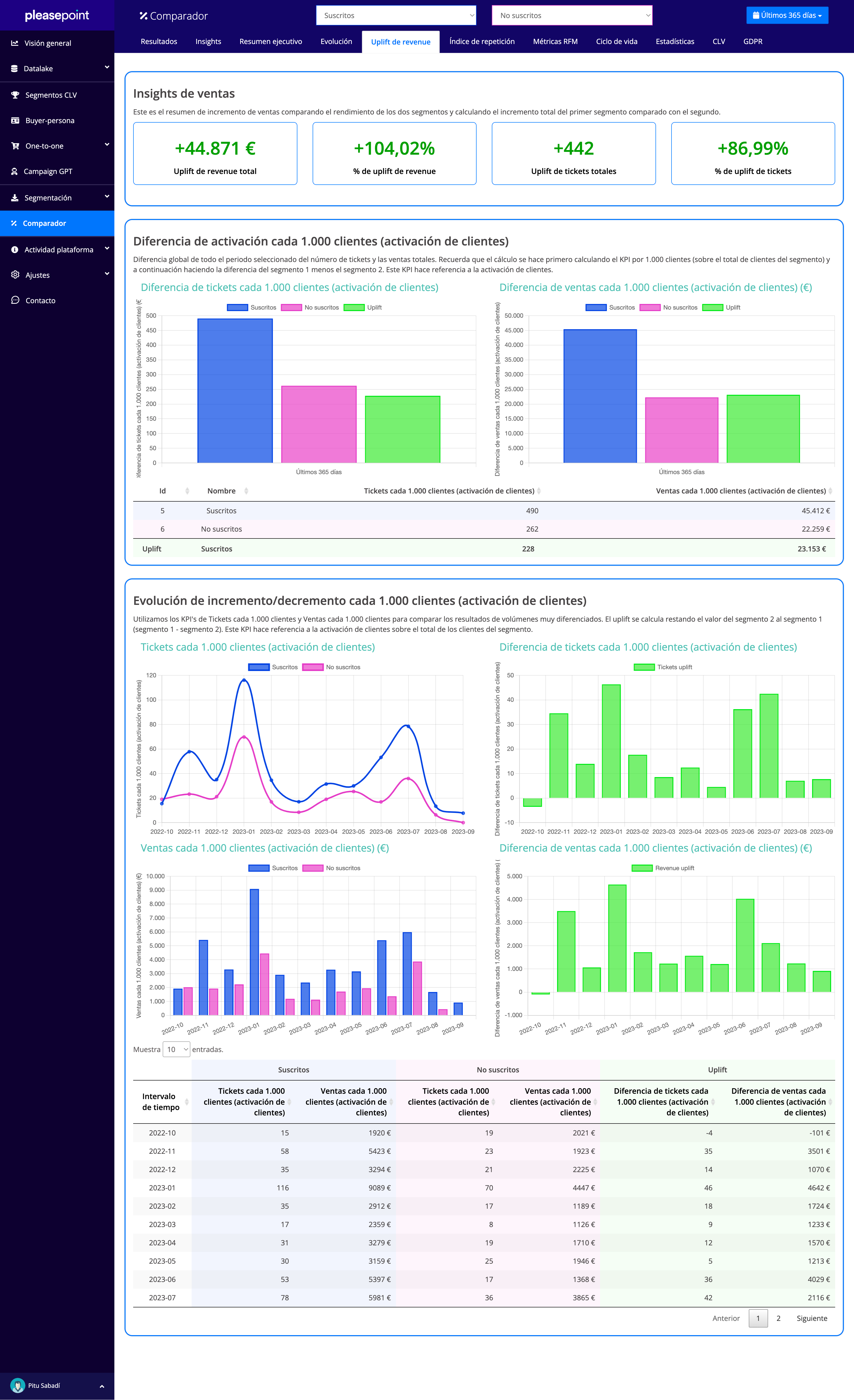 Recuerda que con Pleasepoint podrás segmentar las audiencias de clientes, híper-personalizar tus acciones y medir los resultados de un forma fácil y amigable, sin necesidad de sumergirte en un análisis profundo de datos. Nuestra plataforma basada en machine learning lo hace por ti.