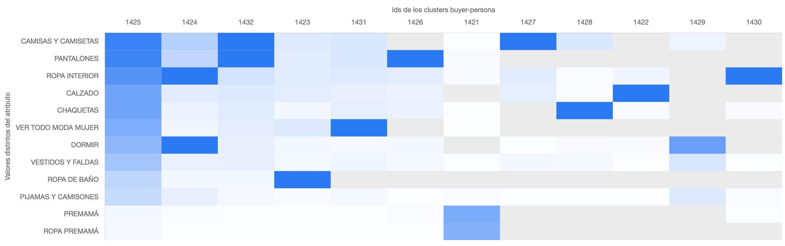Ejemplo de clasificación de clientes según la propensión de compra a las distintas categorías de productos en una marca de moda de mujer.