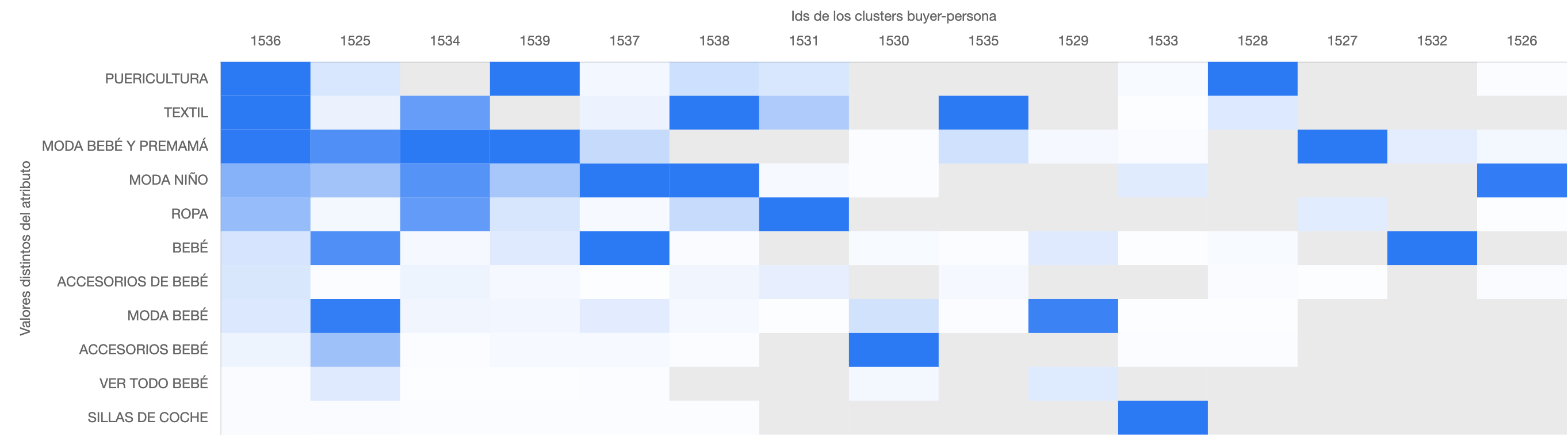 Ejemplo de clasificación de clientes según las distintas categorías de productos en el sector del bebé. Este sector es perfecto para la personalización, dada su repetición de compra y el rápido crecimiento de los hijos.