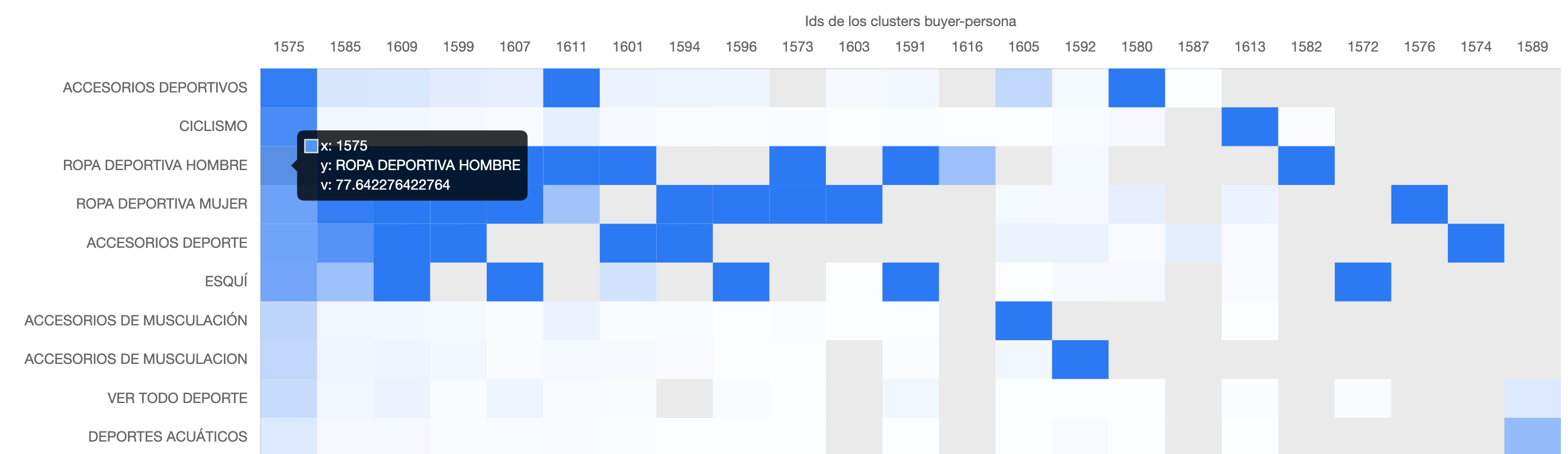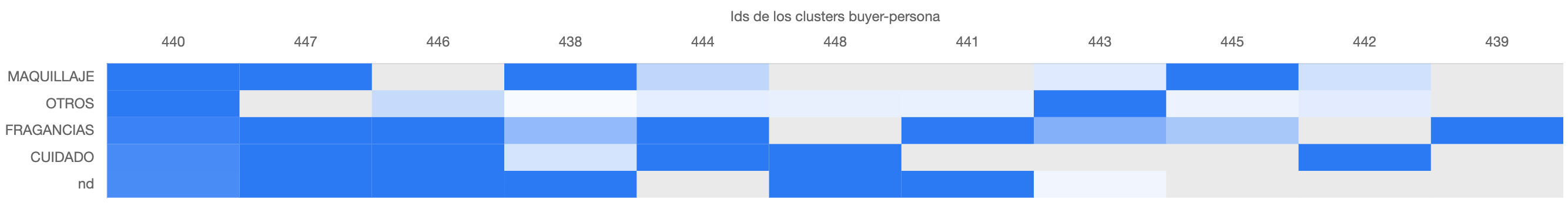Ejemplo de clasificación de clientes según la propensión de compra a lo distintos ejes de productos en un ejemplo del sector cosmética. La repetición de compra en el sector es alta y la personalización es capaz de incrementar considerablemente el ROI de tus campañas.