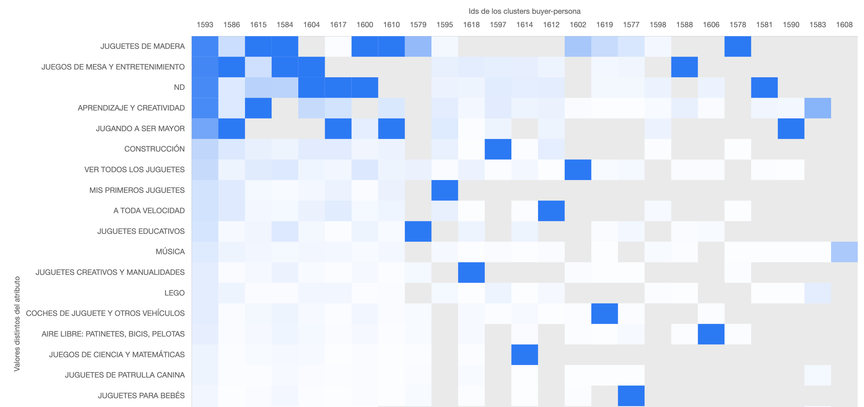 Clasificación de lientes según la propensión de compra a las distintas categorías en un ejemplo del sector juguetes. Igual que el sector anterior, los juguetes son un ejemplo ideal para mejorar la repetición de compra gracias a la híper-personalización de los contenidos.