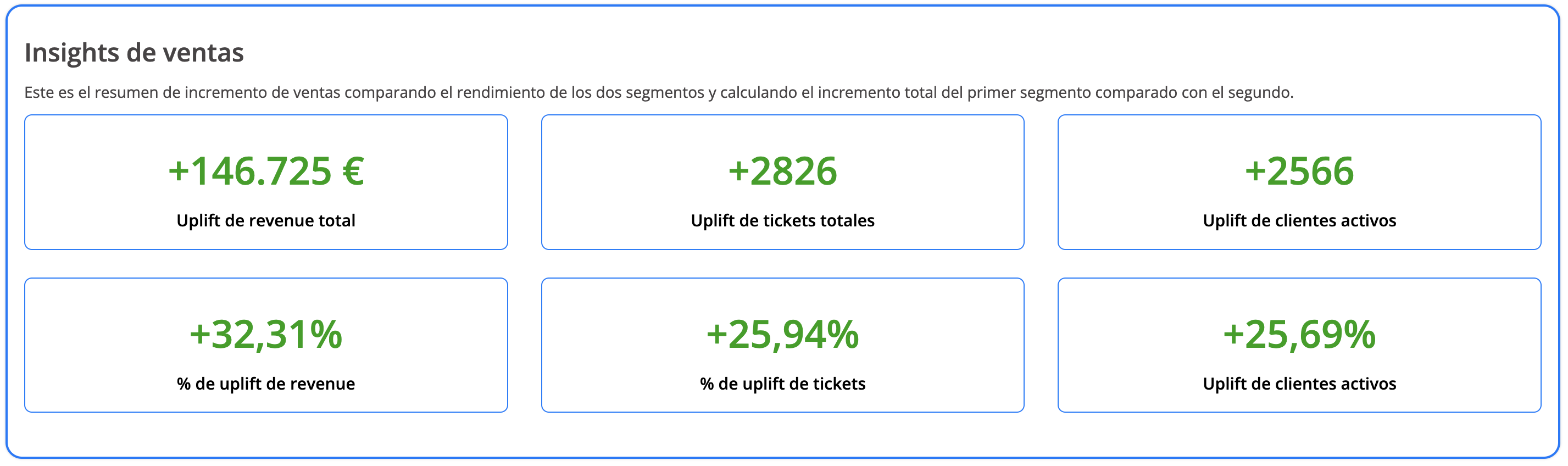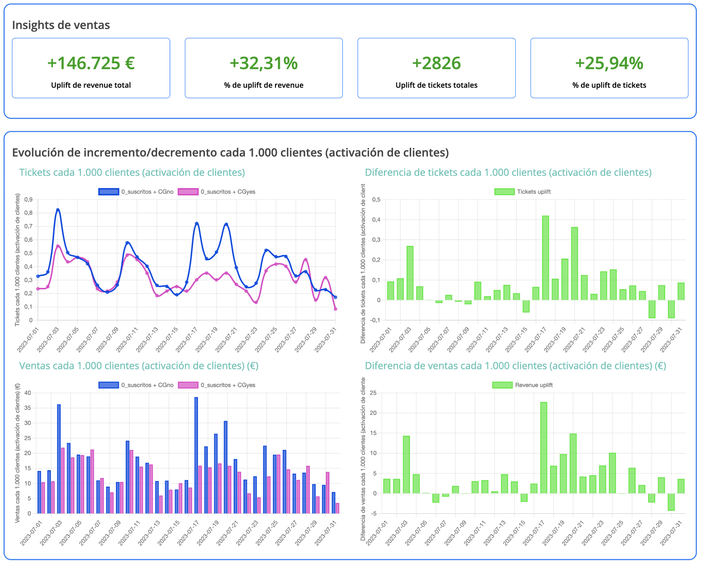 Los resultados que mostramos son frutos de la comparación con un grupo de control, en este caso del 5% y comparando los KPIs de ventas y tickets cada 1.000 clientes en cada uno de los segmentos.